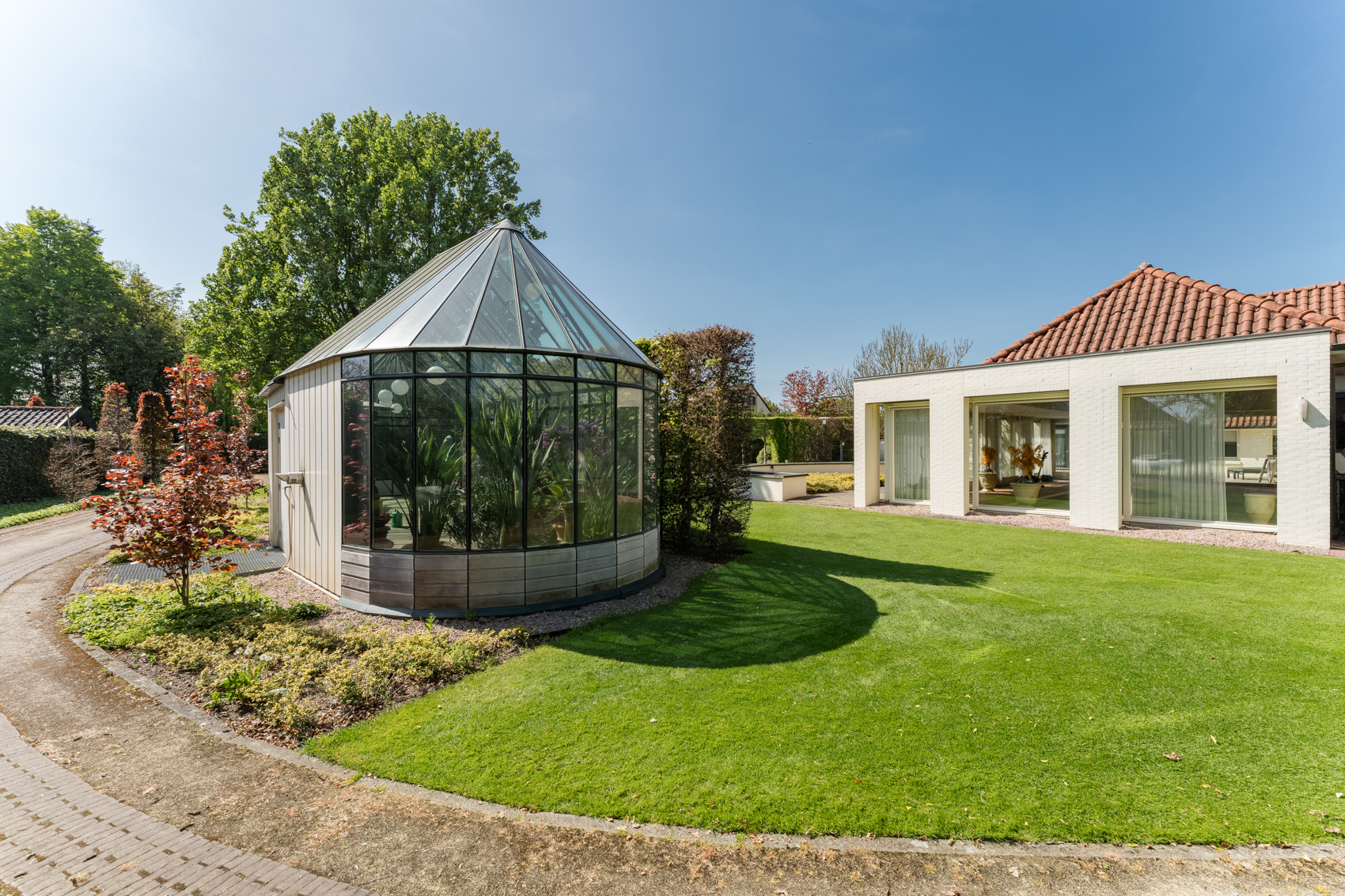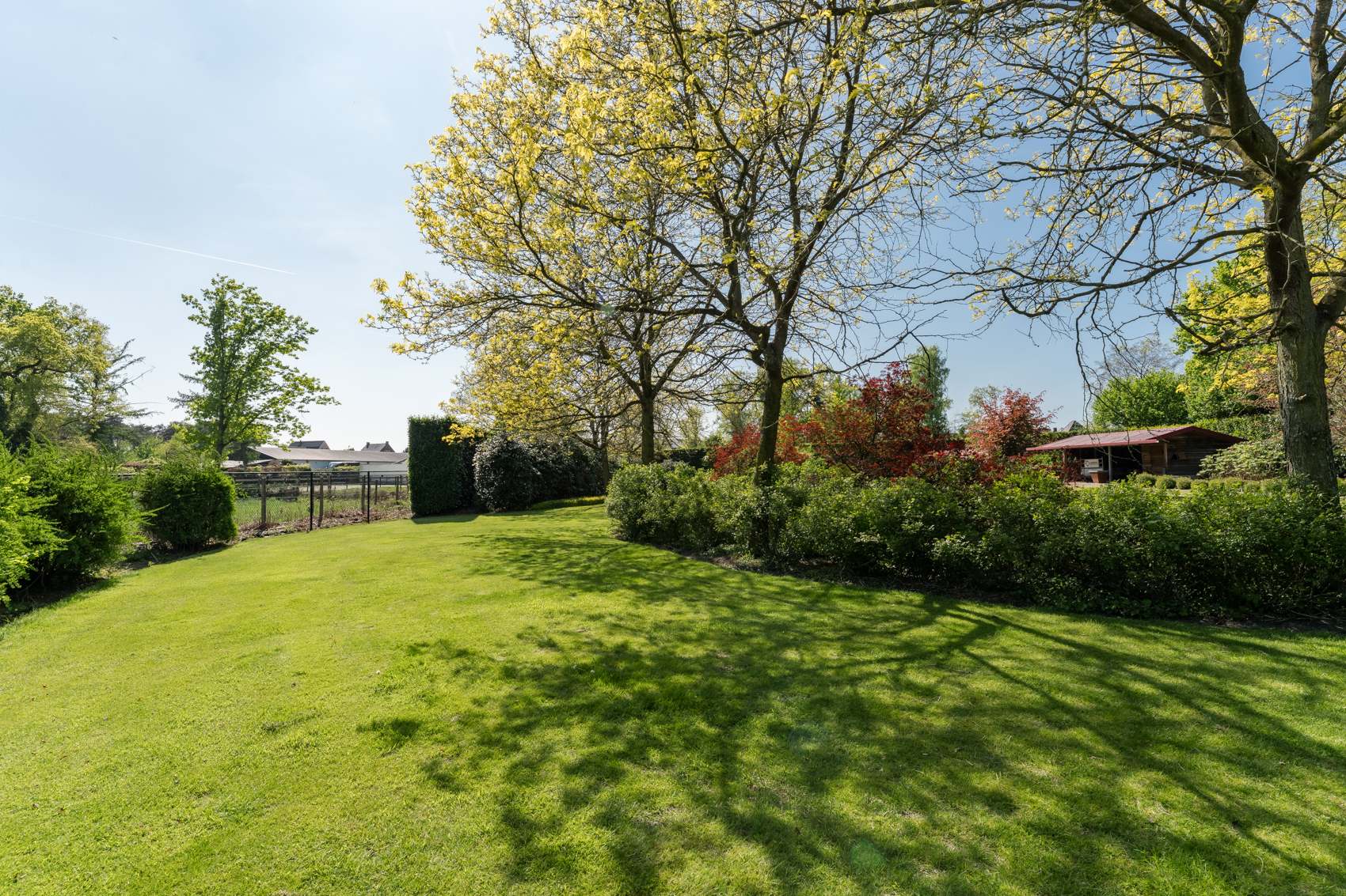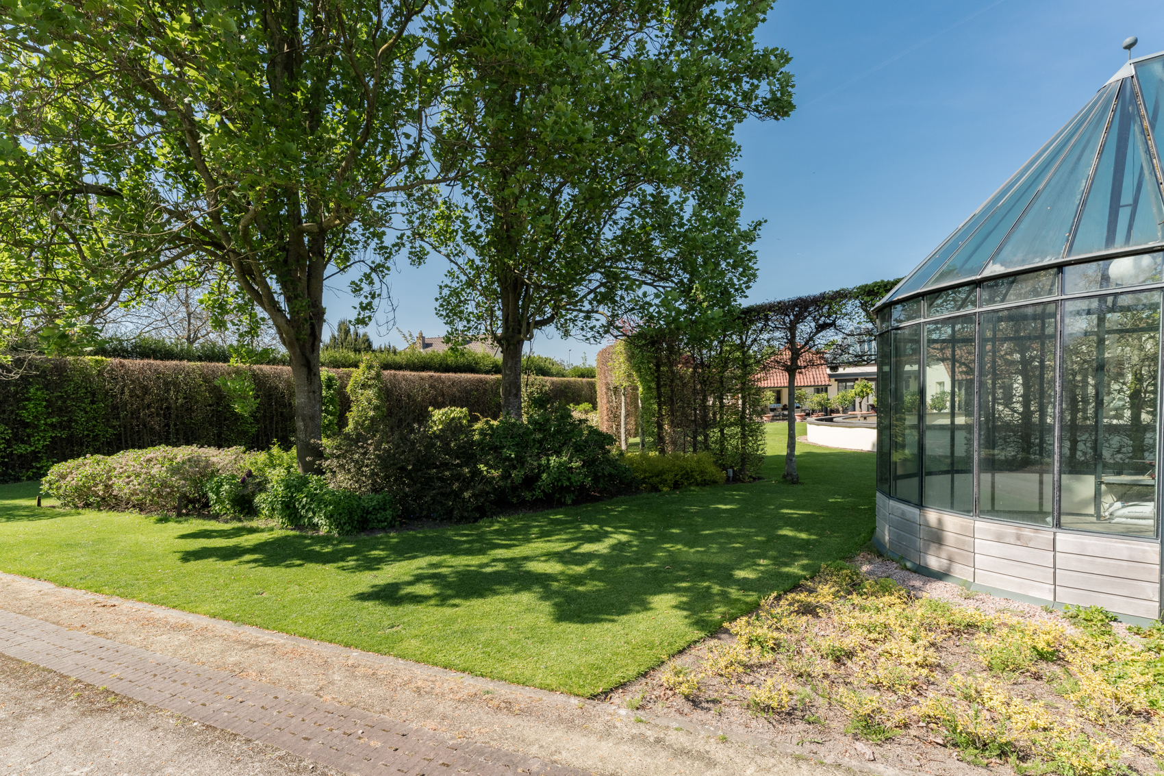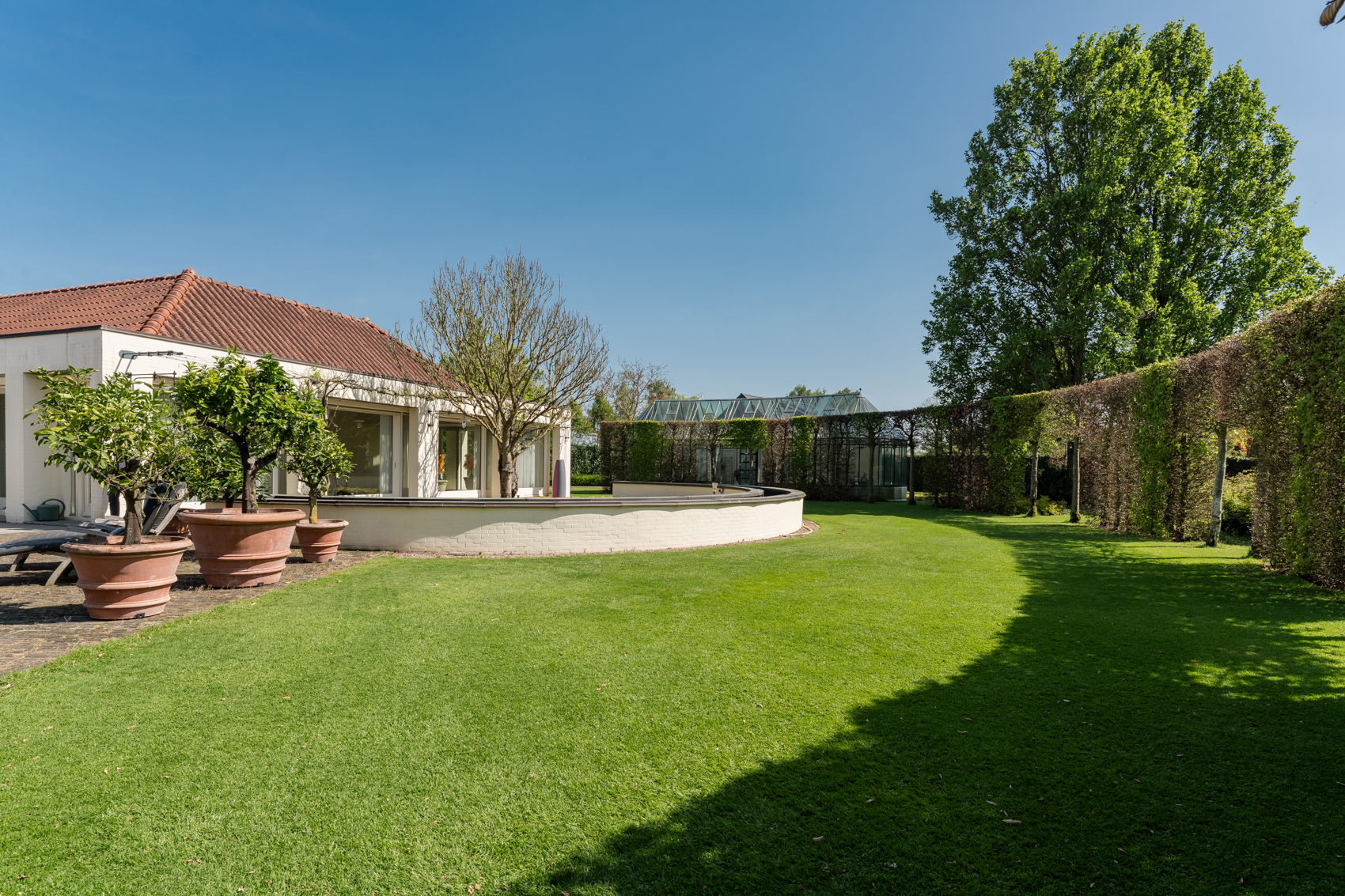 Tevens is er een ruim bijgebouw met ruime inpandige garage en binnenzwembad, maar ook met alle voorzieningen om fijne momenten te organiseren en/of logés te herbergen. Tevens is er een serre en een beregeningsinstallatie op grondwater met meerdere circuits voor alle tuingedeeltes. De woning en het bijgebouw worden ‘s avonds mooi verlicht.