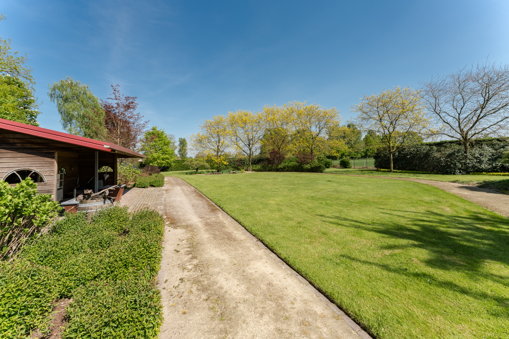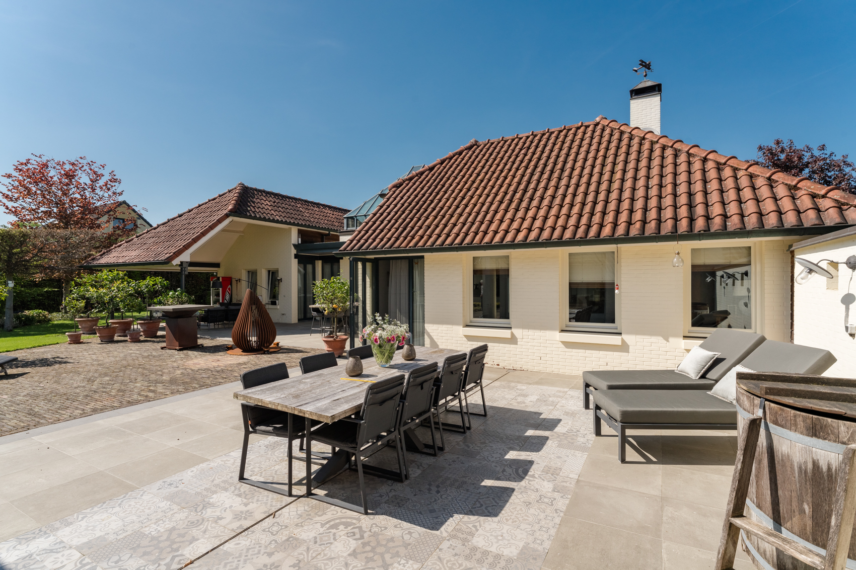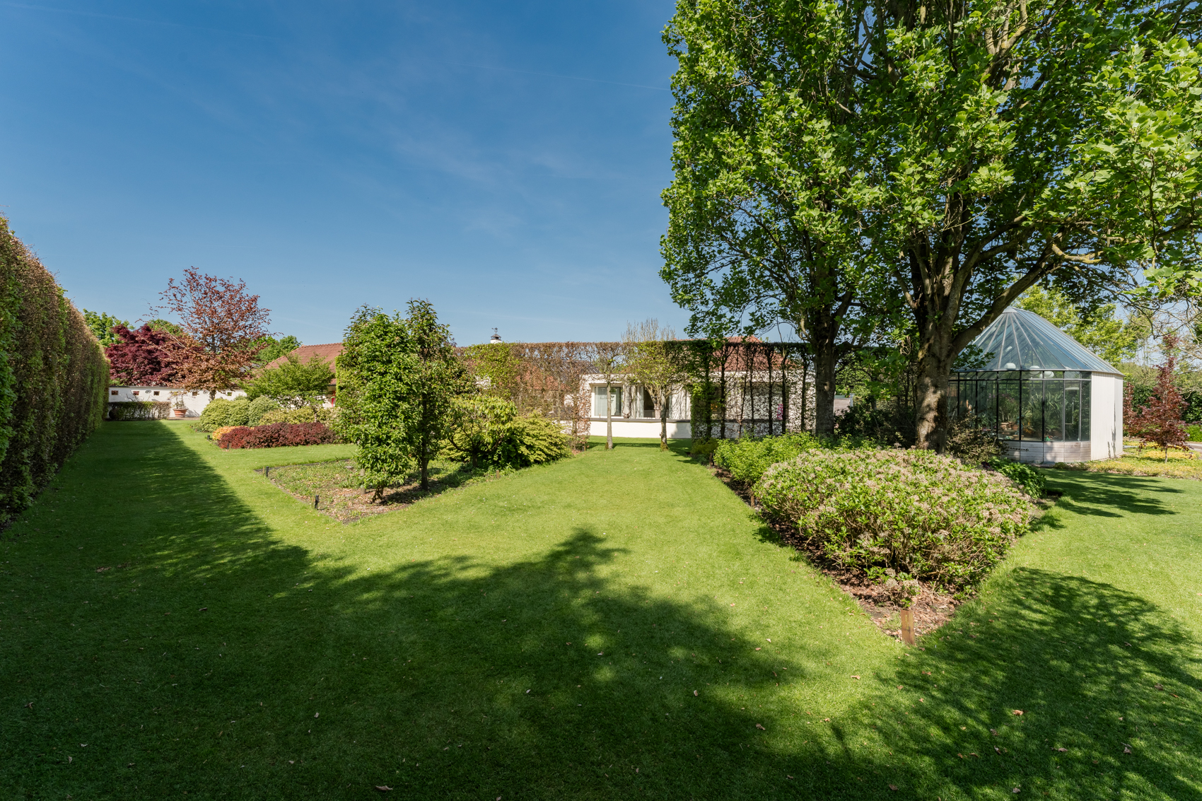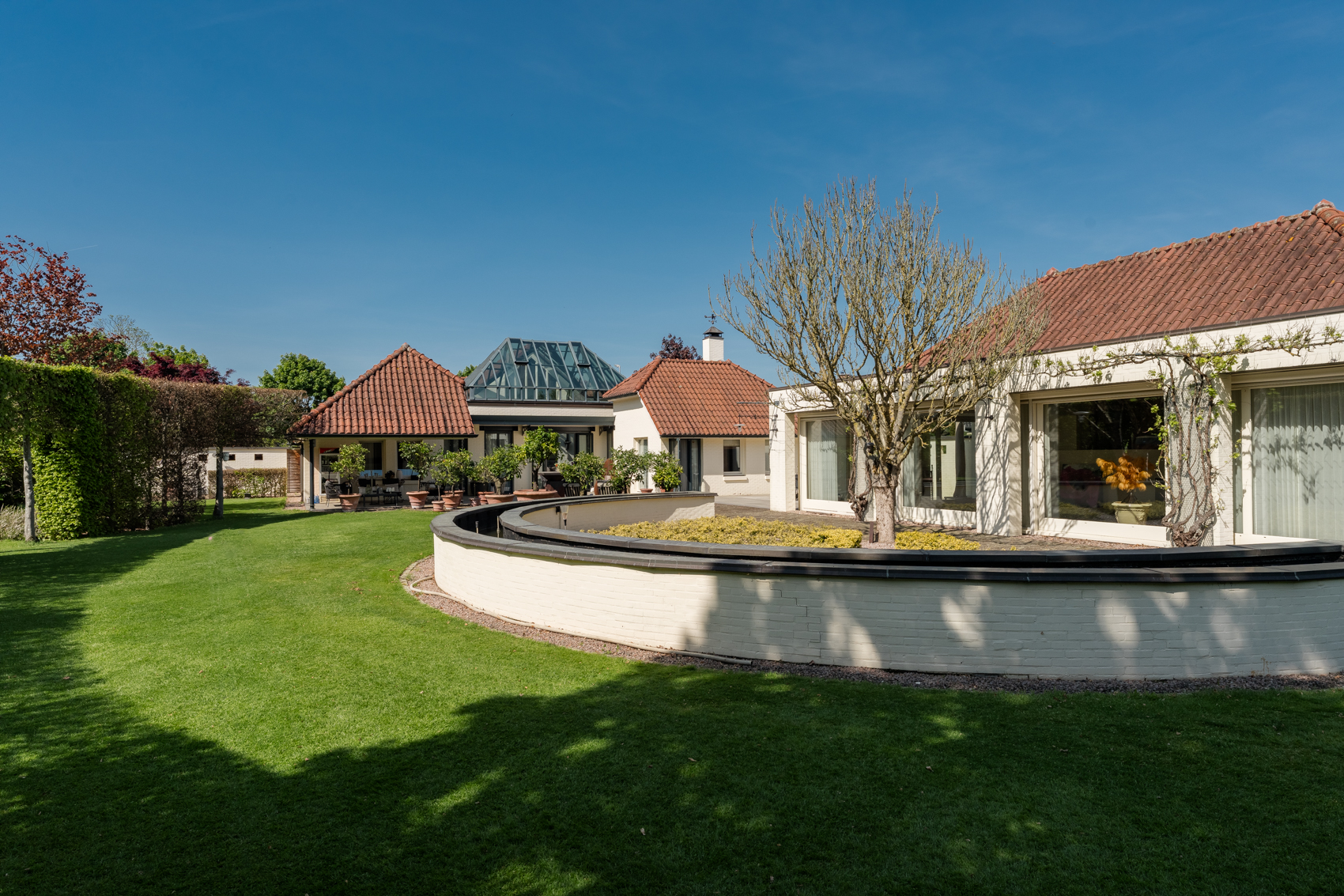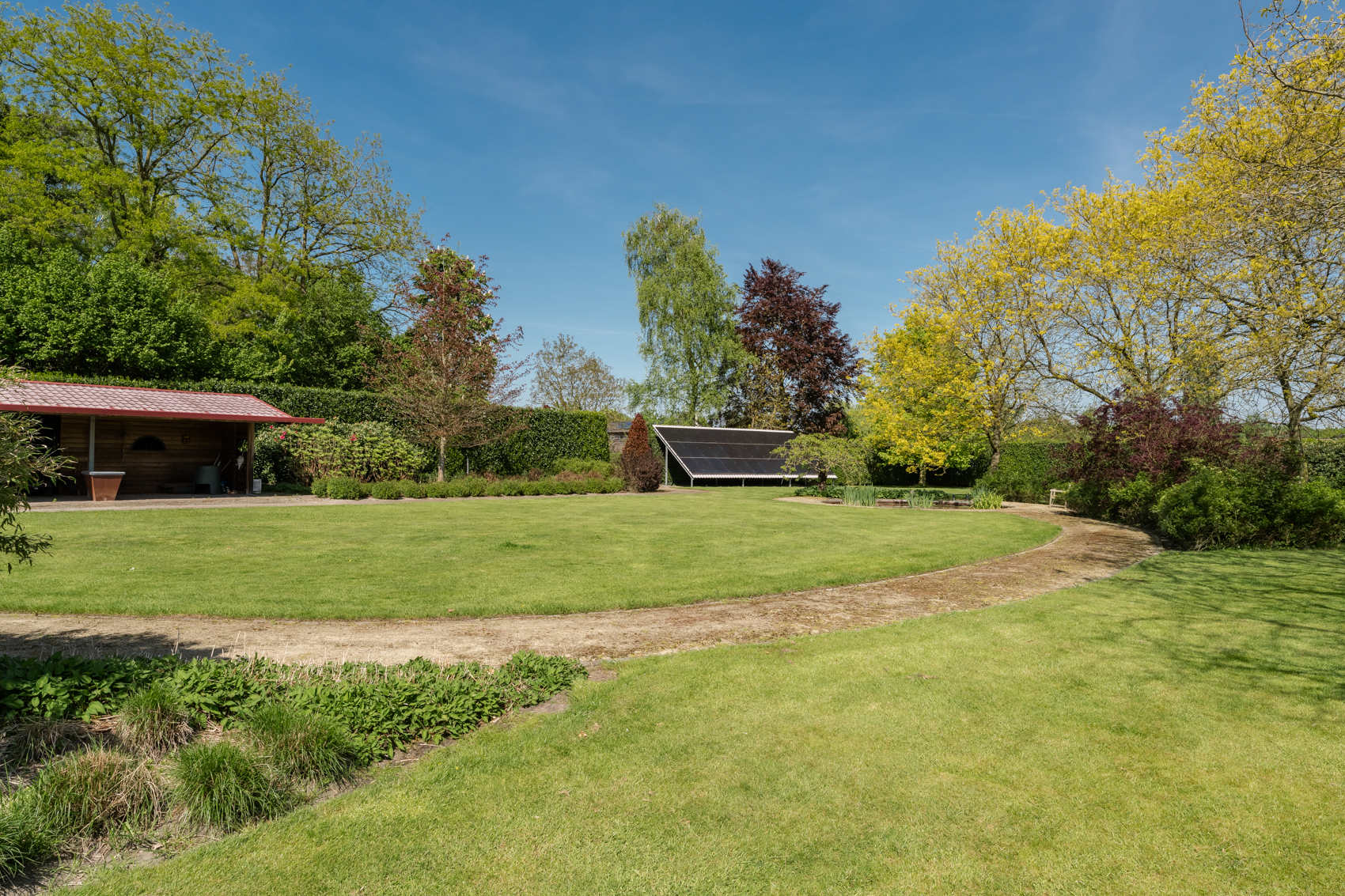 Tevens is er een ruim bijgebouw met ruime inpandige garage en binnenzwembad, maar ook met alle voorzieningen om fijne momenten te organiseren en/of logés te herbergen. Tevens is er een serre en een beregeningsinstallatie op grondwater met meerdere circuits voor alle tuingedeeltes. De woning en het bijgebouw worden ‘s avonds mooi verlicht.