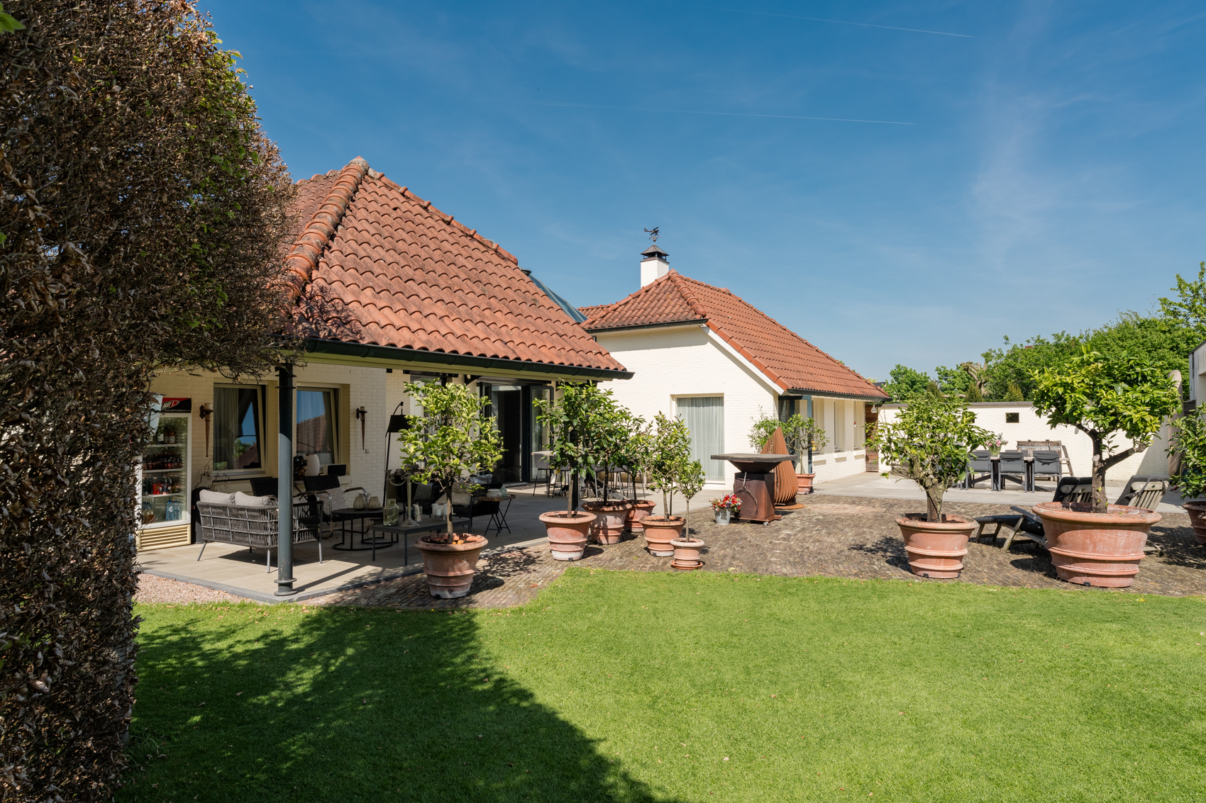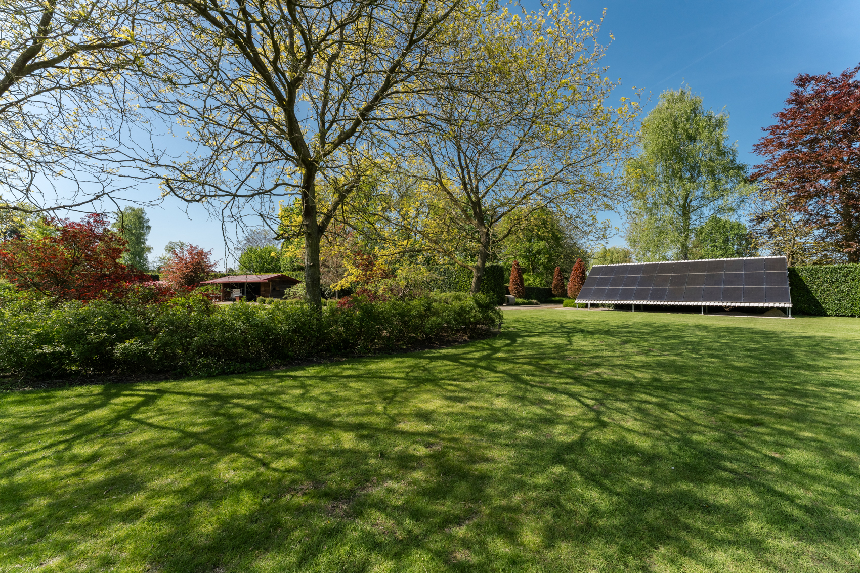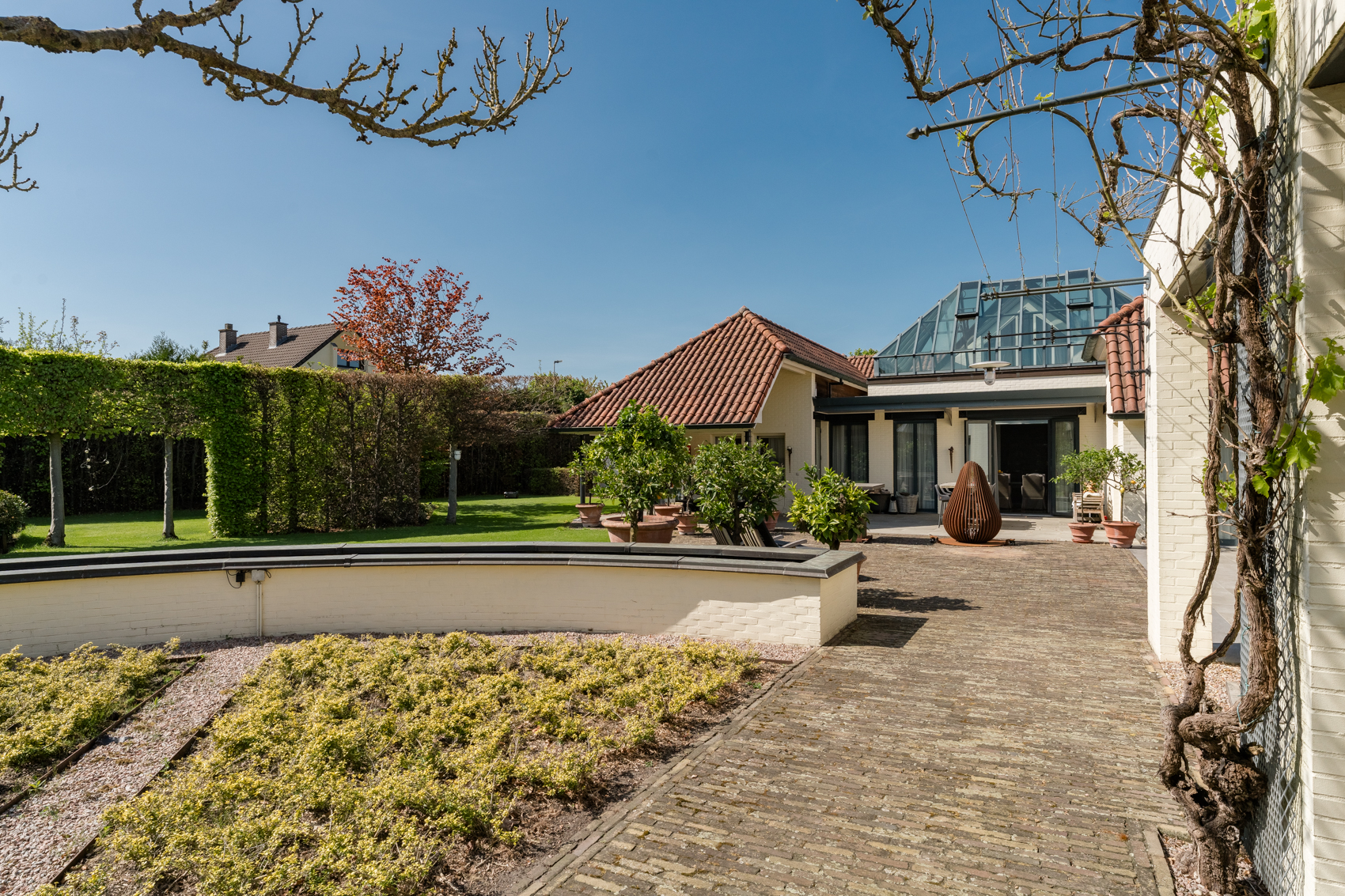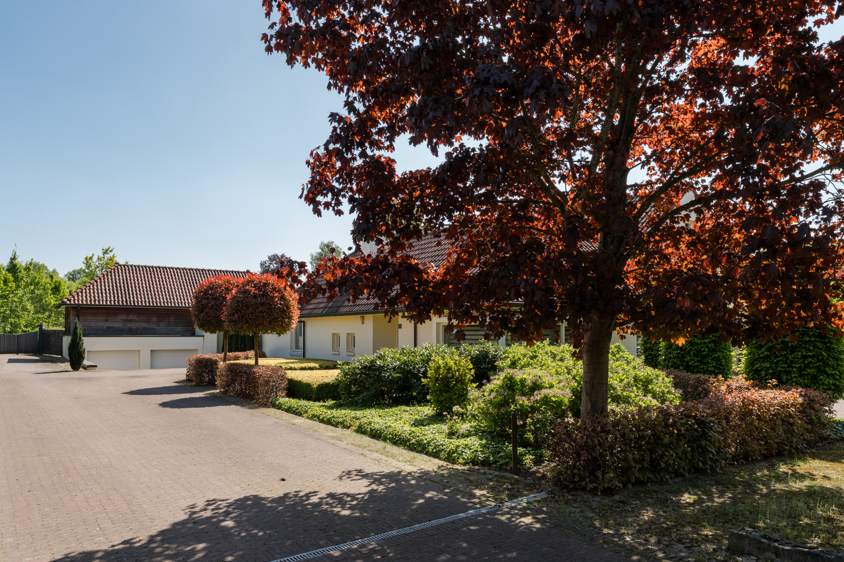 Tevens is er een ruim bijgebouw met ruime inpandige garage en binnenzwembad, maar ook met alle voorzieningen om fijne momenten te organiseren en/of logés te herbergen. Tevens is er een serre en een beregeningsinstallatie op grondwater met meerdere circuits voor alle tuingedeeltes. De woning en het bijgebouw worden ‘s avonds mooi verlicht.