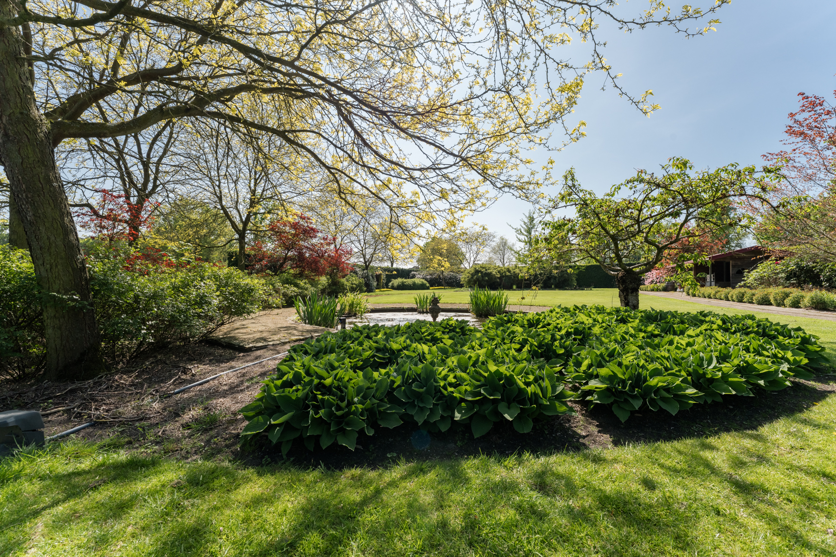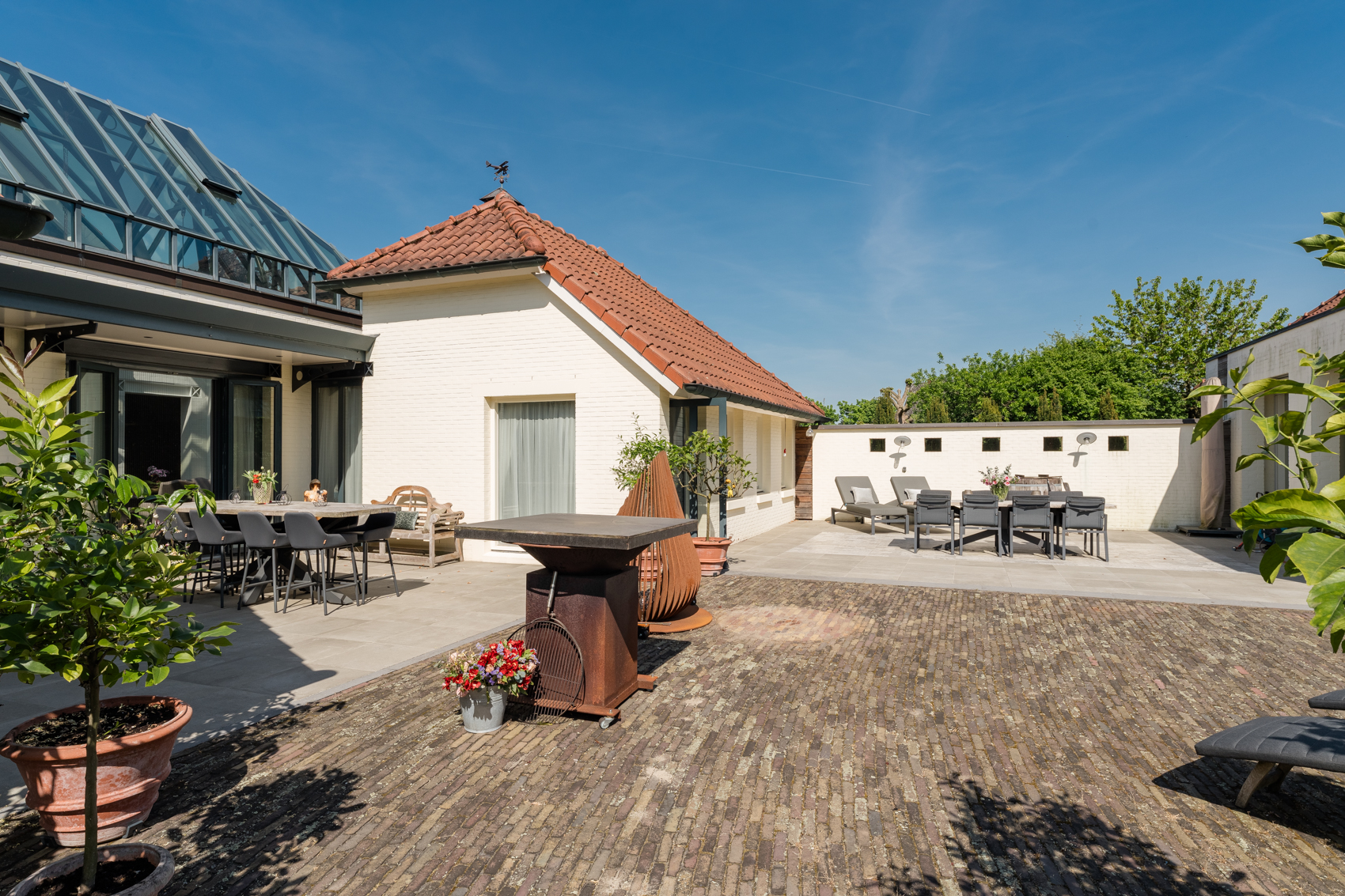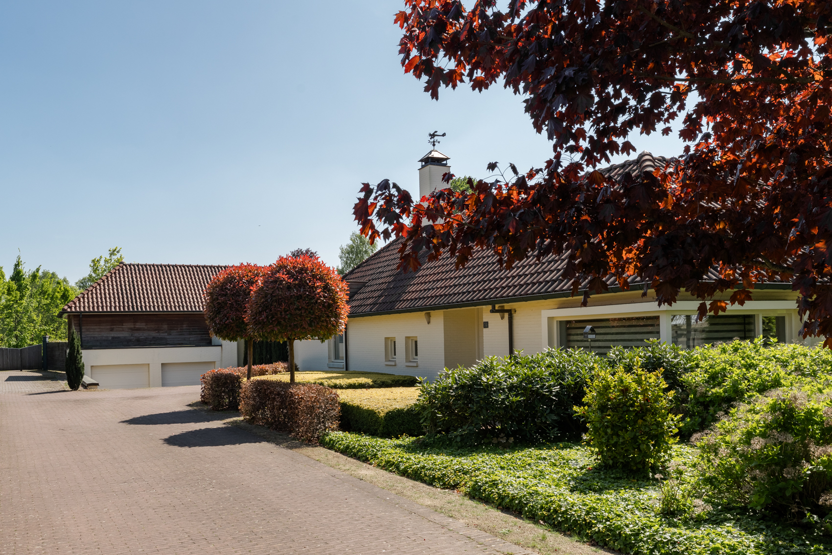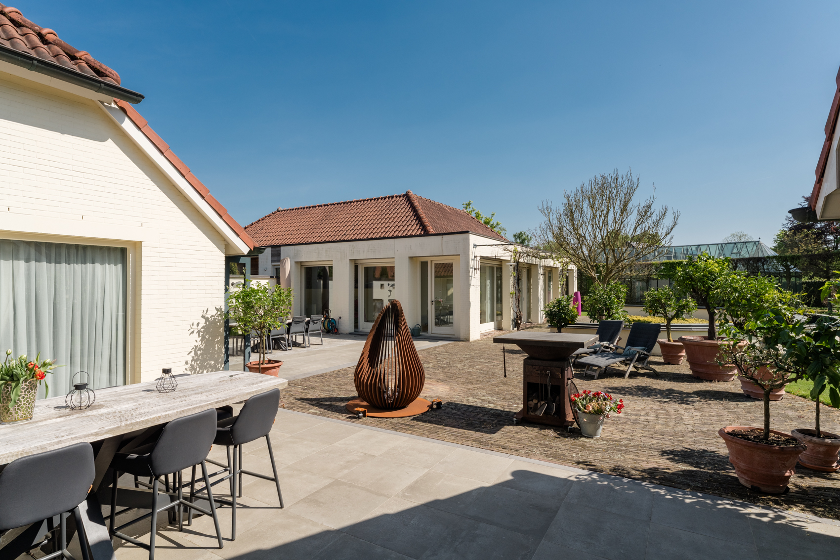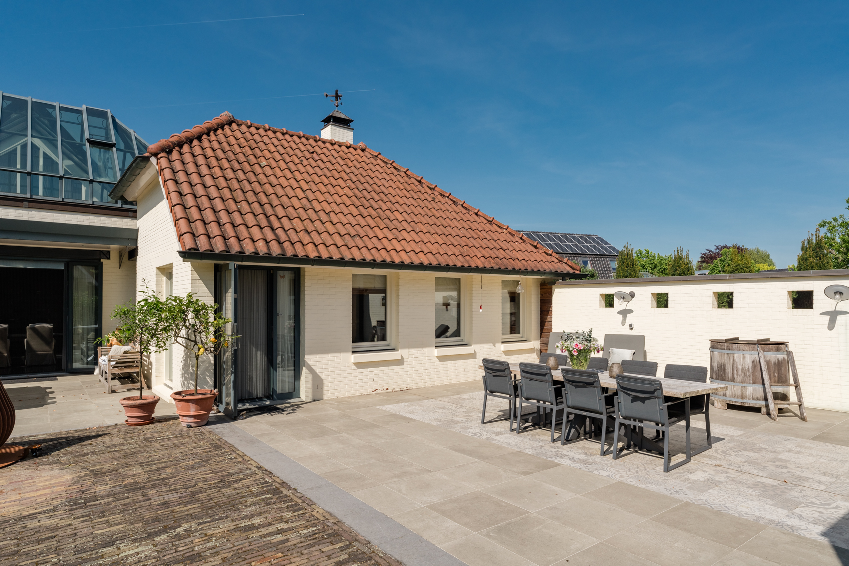 Tevens is er een ruim bijgebouw met ruime inpandige garage en binnenzwembad, maar ook met alle voorzieningen om fijne momenten te organiseren en/of logés te herbergen. Tevens is er een serre en een beregeningsinstallatie op grondwater met meerdere circuits voor alle tuingedeeltes. De woning en het bijgebouw worden ‘s avonds mooi verlicht.