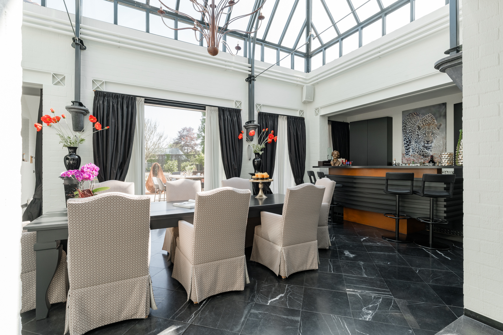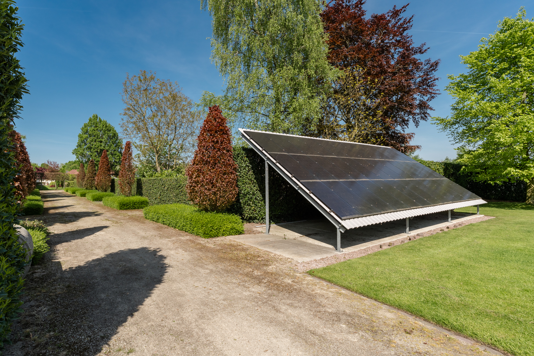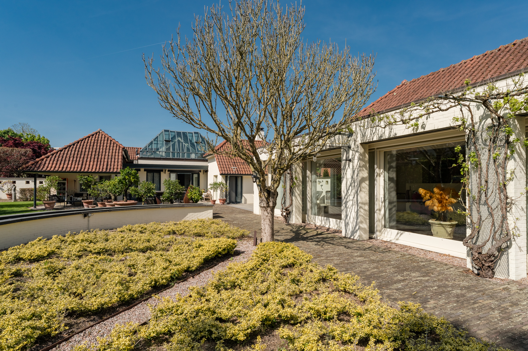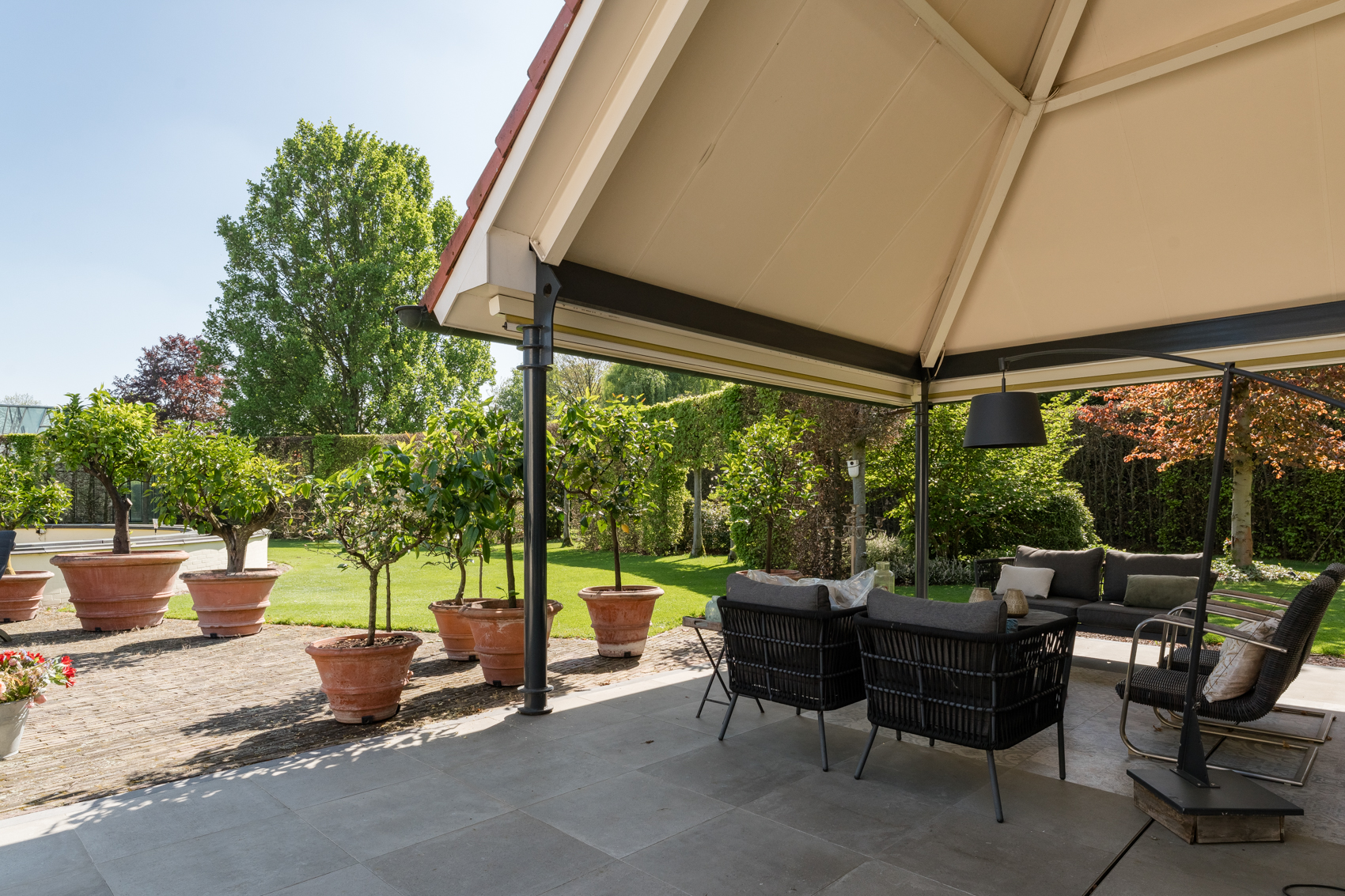 Tevens is er een ruim bijgebouw met ruime inpandige garage en binnenzwembad, maar ook met alle voorzieningen om fijne momenten te organiseren en/of logés te herbergen. Tevens is er een serre en een beregeningsinstallatie op grondwater met meerdere circuits voor alle tuingedeeltes. De woning en het bijgebouw worden ‘s avonds mooi verlicht.