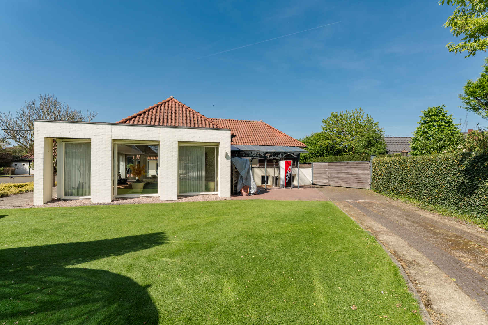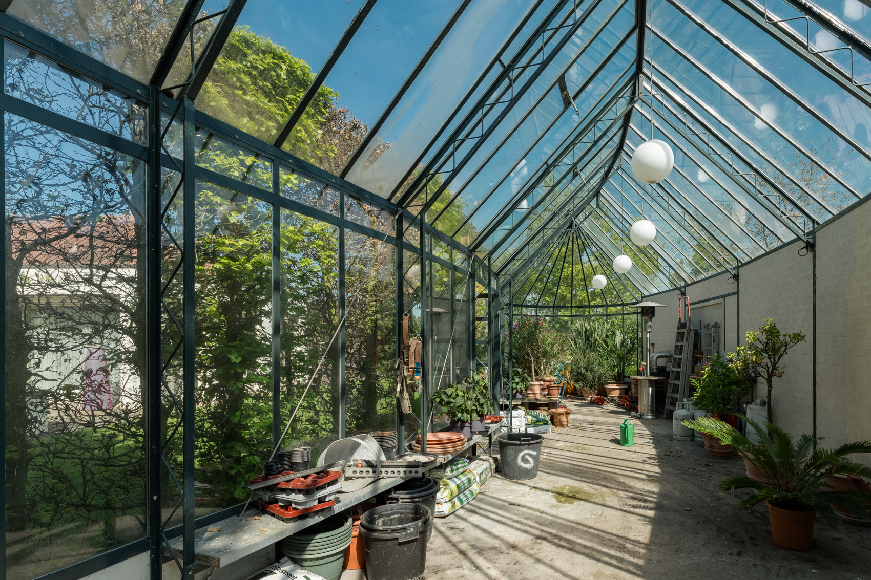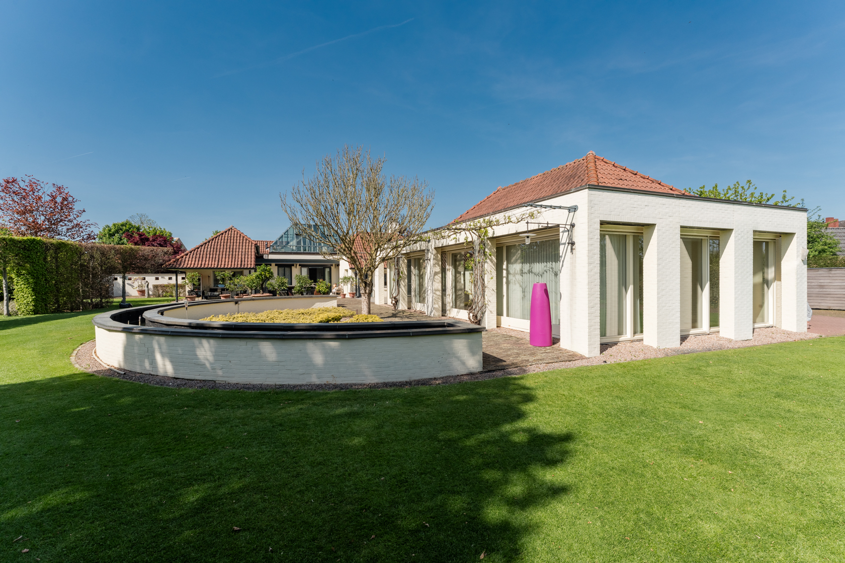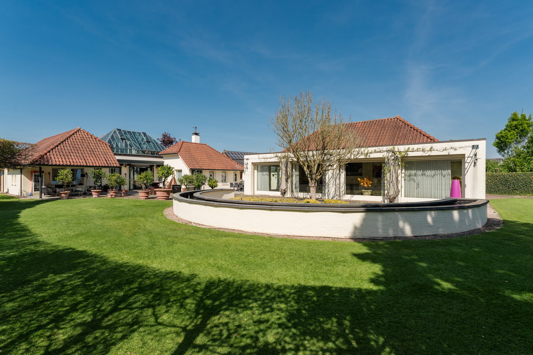 + Vergund bijgebouw, nu vooral garage en binnenzwembad, maar met potentie tot meer