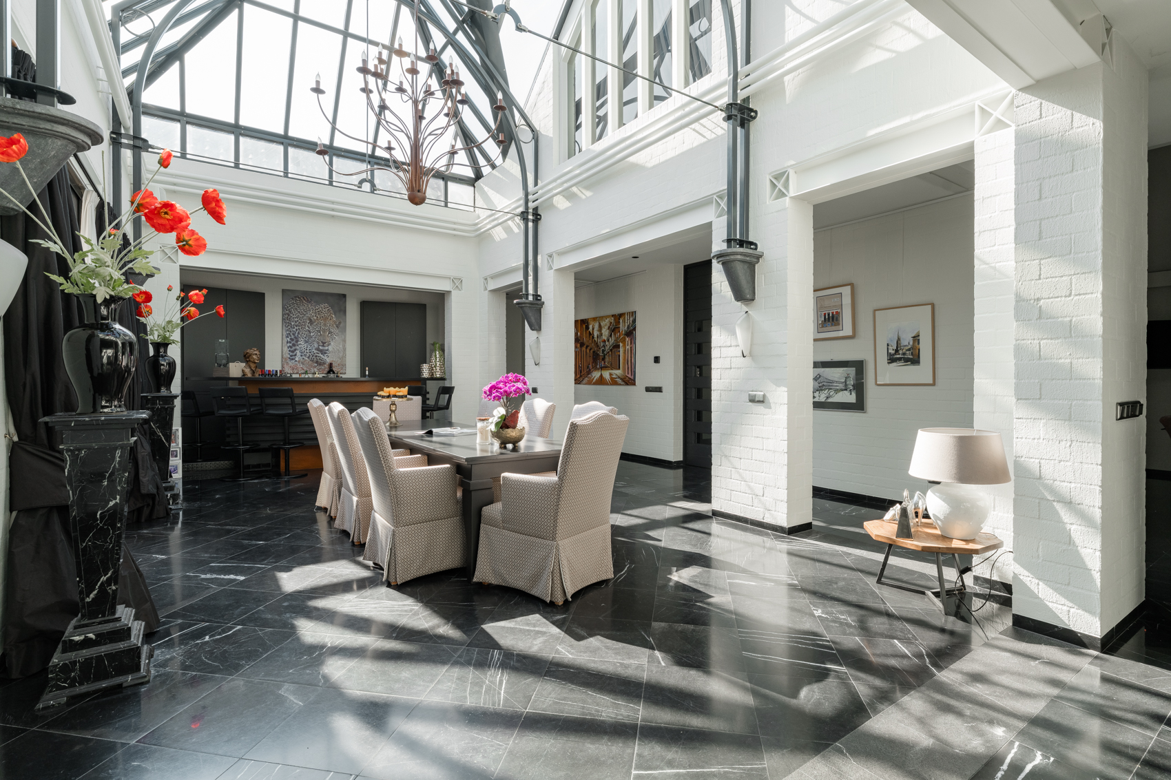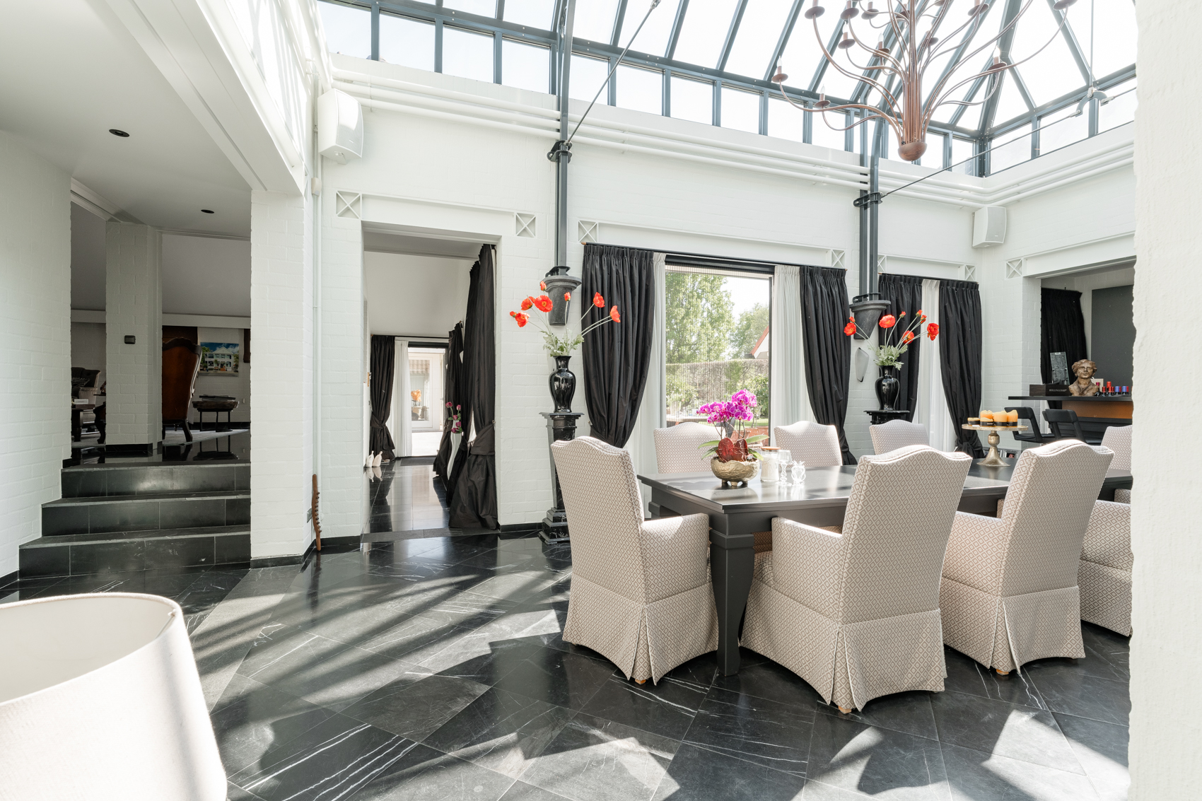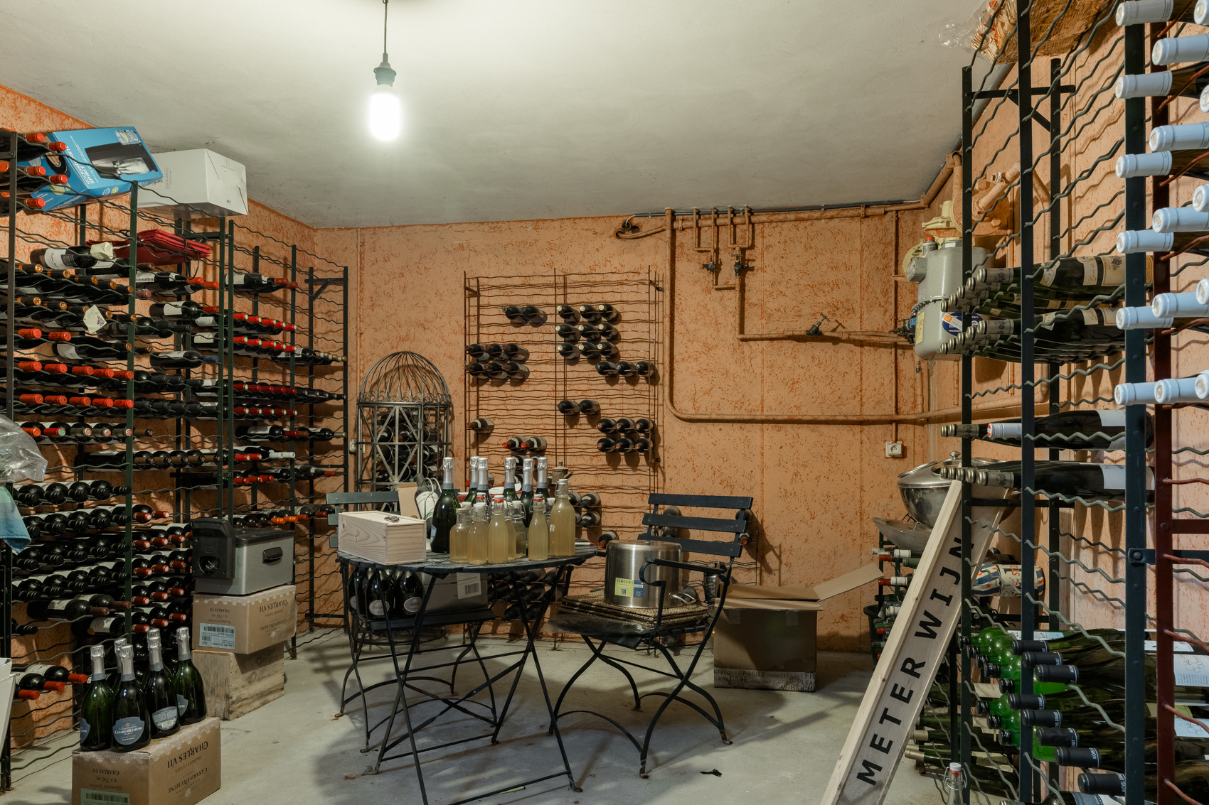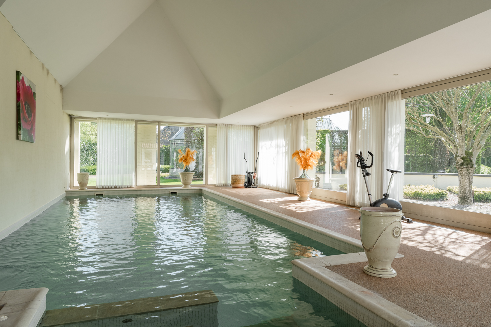 Gelijkvloers is een fraaie entree, een uitnodigende leefruimte met keuken en was-/voorraadberging, (wijn)kelder, een ruime master bedroom met badkamer en dressing, een bijgebouw met binnenzwembad en ruime inpandige garage, op propaangas verwarmde serre/oranjerie.