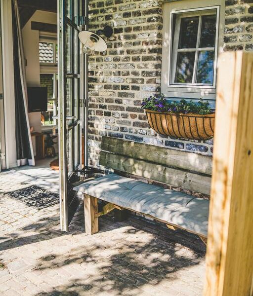 Eigen terras met vrijstaande houten berging voor fietsen en dergelijke.