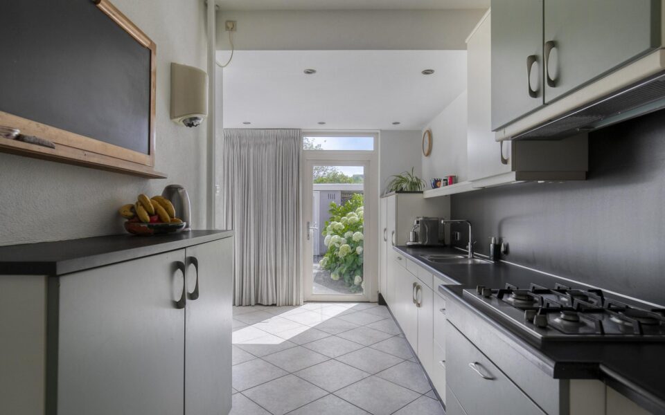 Een uitgebouwde woonkamer (meer dan 9m lang) met schuifpui naar de tuin. De keuken is compleet en uitgebouwd met veel opbergruimte en voorzien van een 4-pits gaskookplaat met afzuigkap, oven, magnetron, koelkast en vaatwasser.