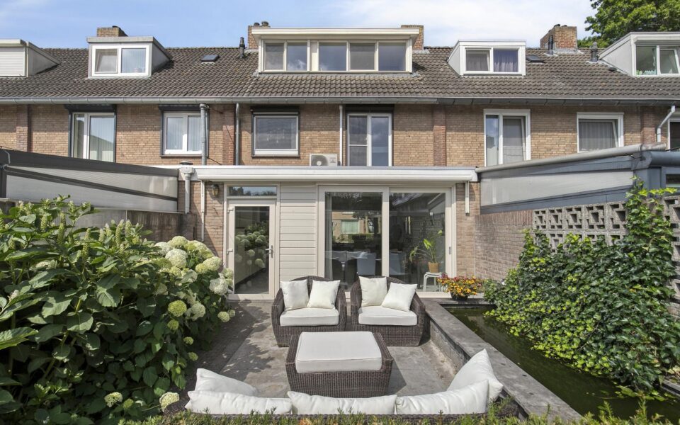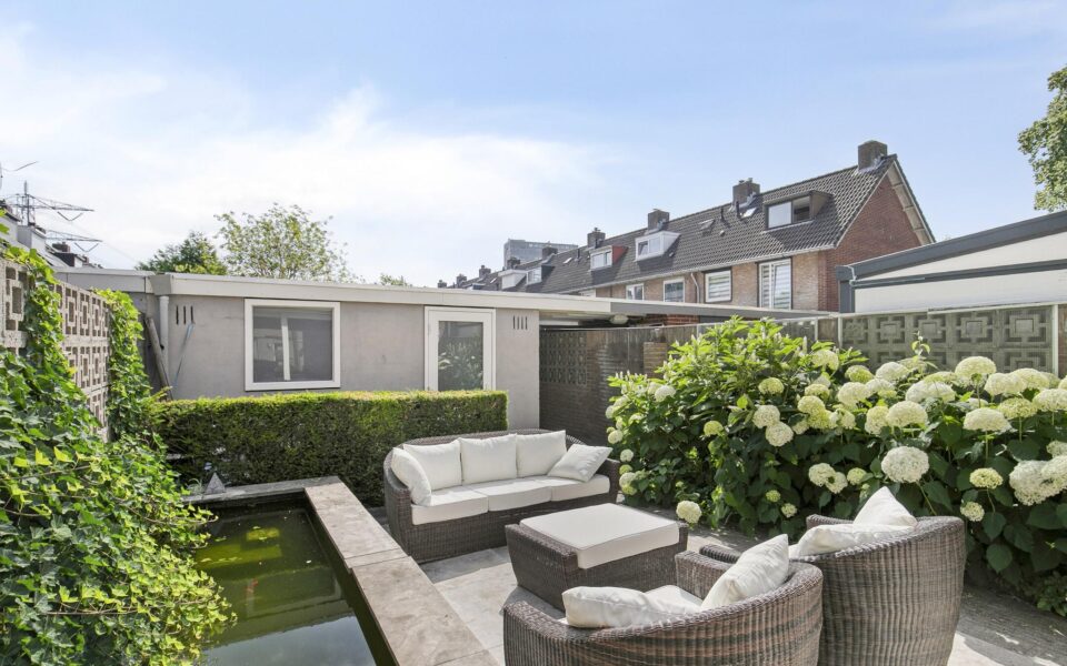 Gezellige tuin met royaal terras, vijverpartij, groene haag en plantenborder. Aan de achterzijde een ruime berging en poort achterom.