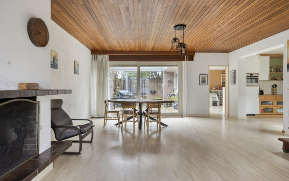 Binnenkomst in de hal met toilet en de meterkast. Hierna volgt een verrassend ruime woonkamer met trapopgang, houthaard en schuifdeur naar de tuin.
