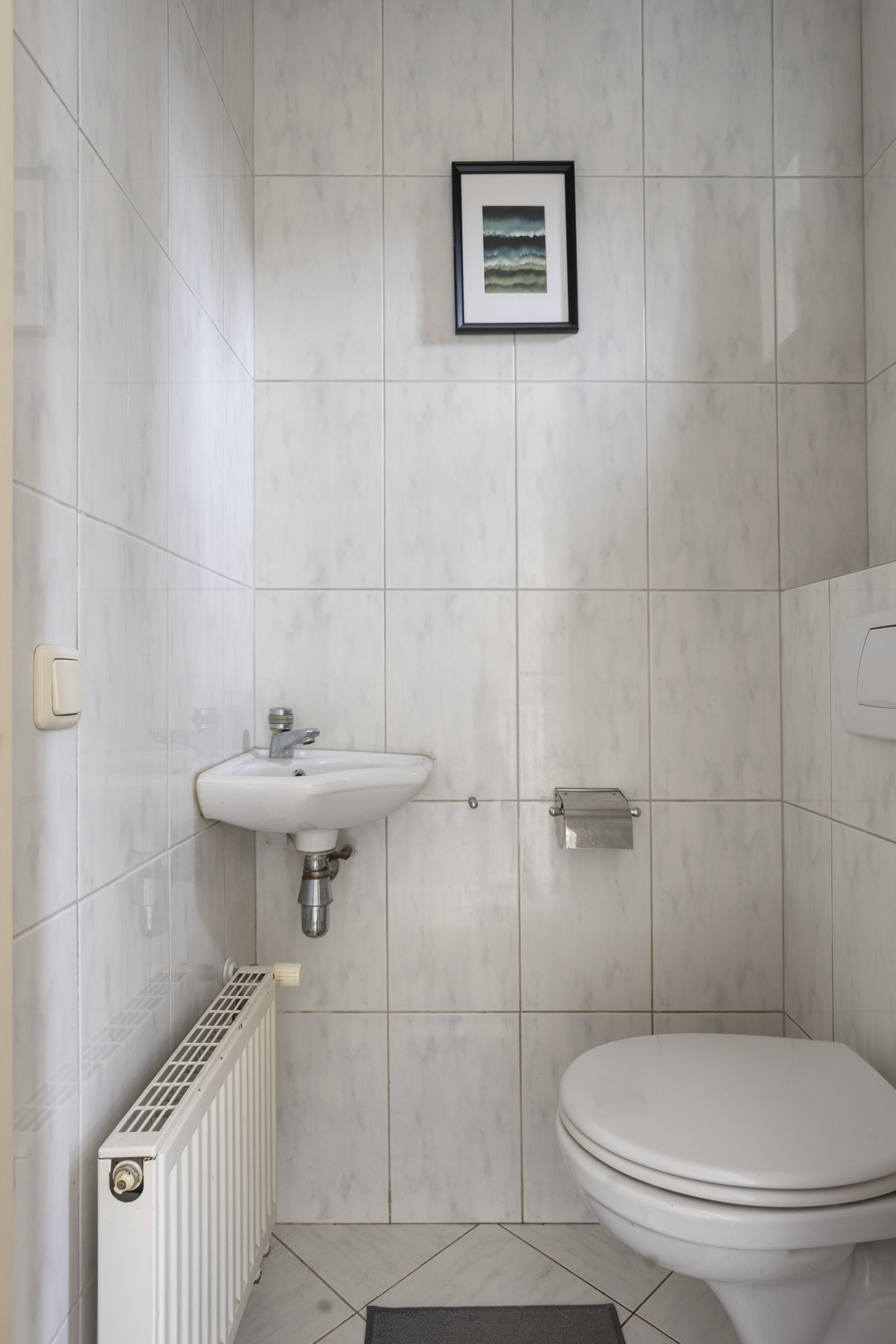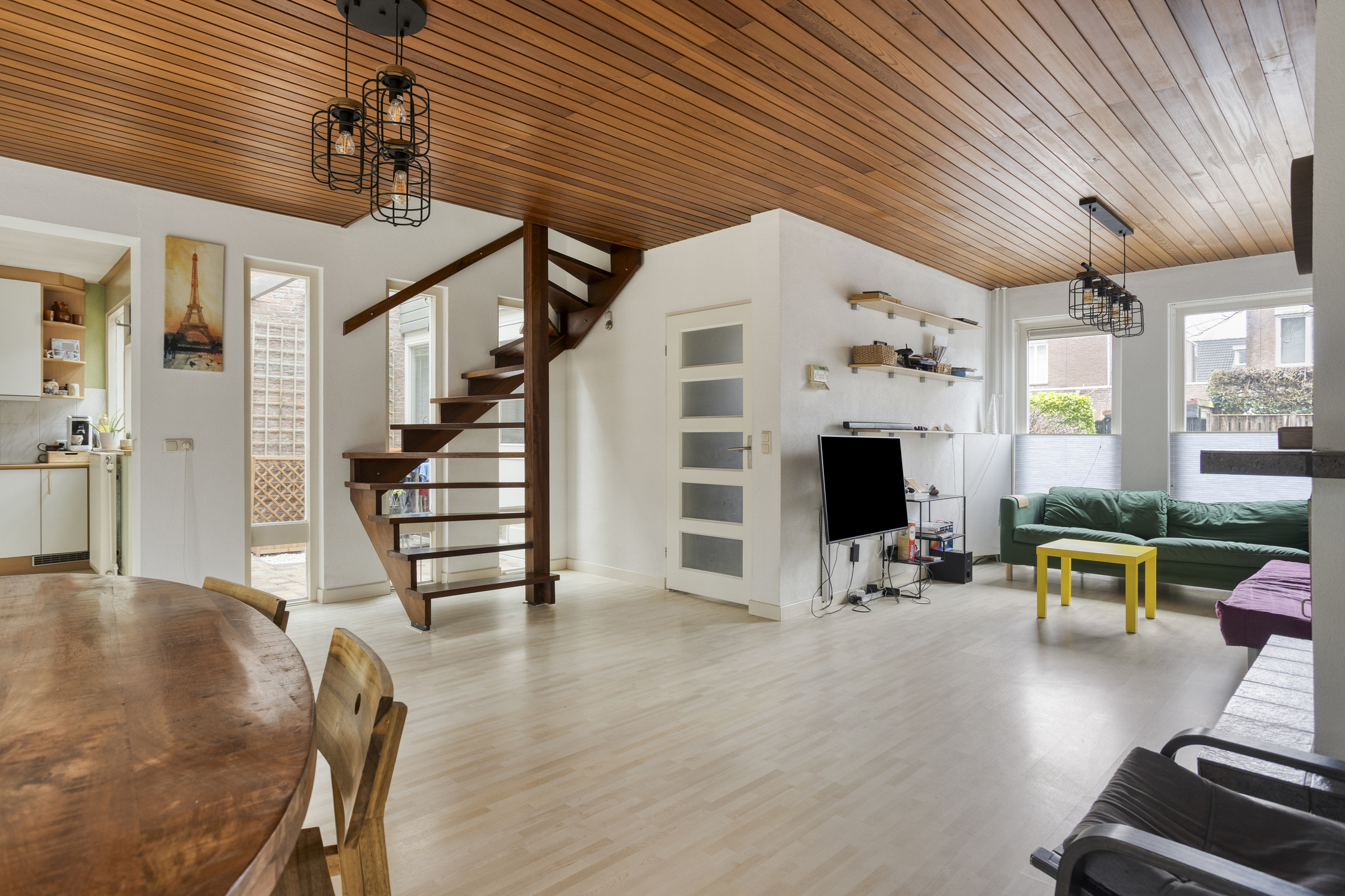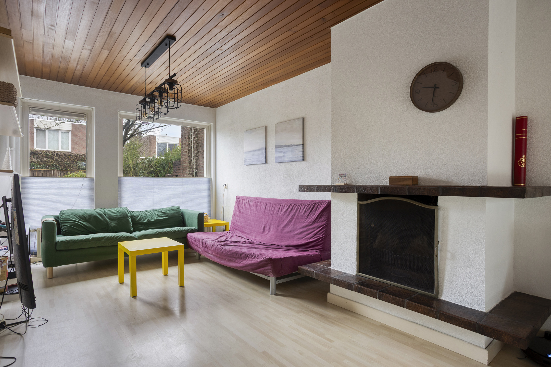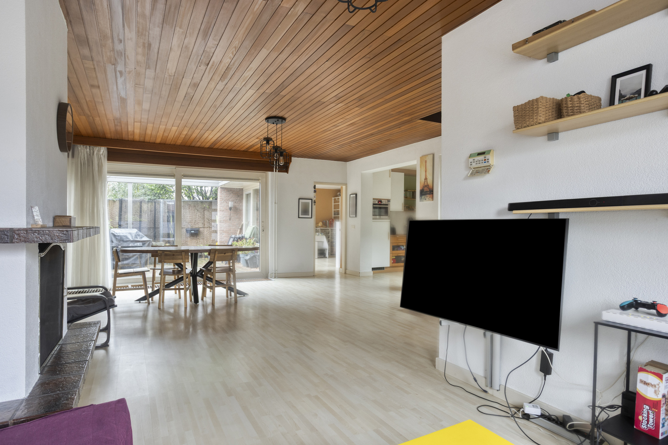 Binnenkomst in de hal met toilet en de meterkast. Hierna volgt een verrassend ruime woonkamer met trapopgang, houthaard en schuifdeur naar de tuin.