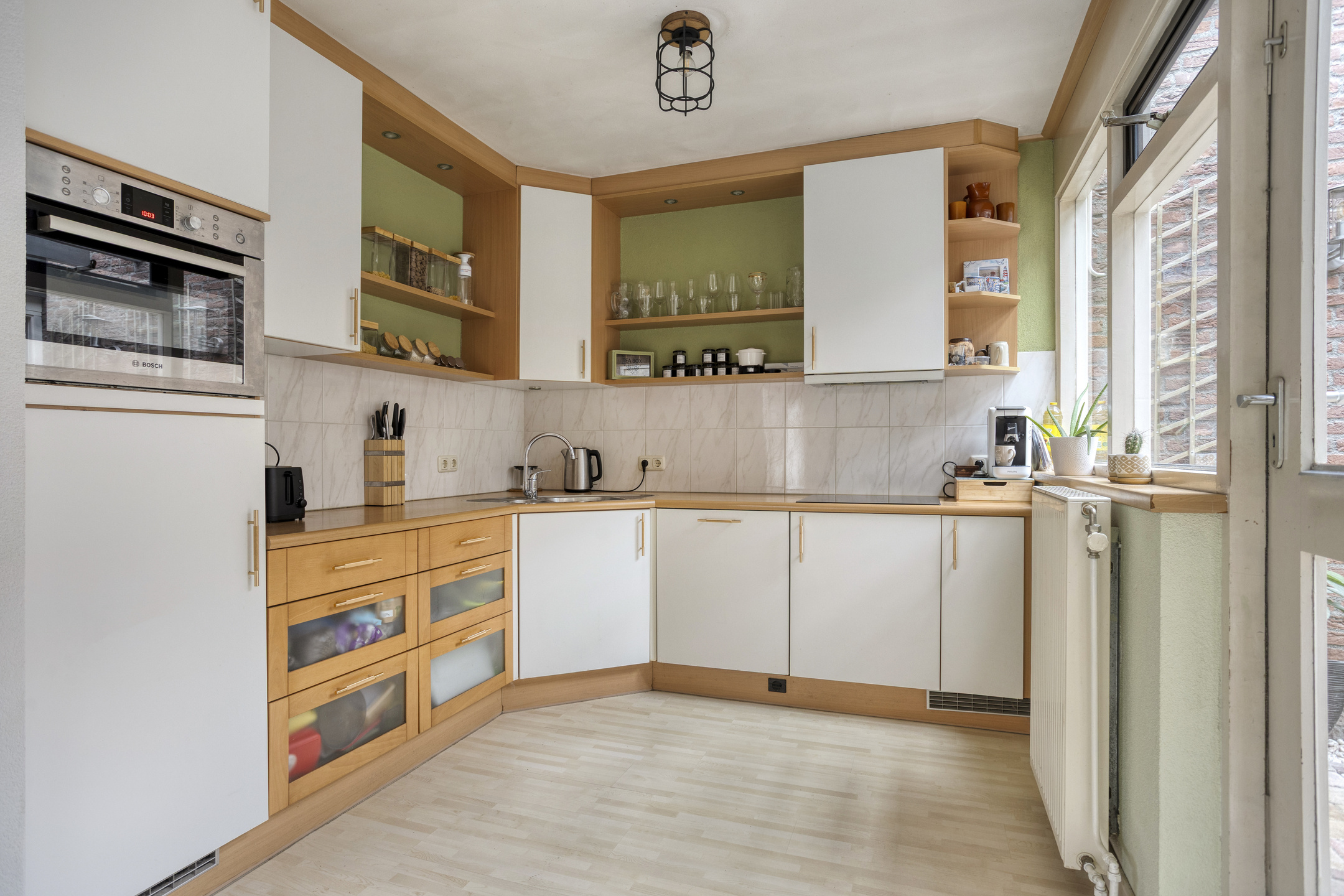 Een open keuken met veel lichtinval vanuit de overdekte patio is voorzien van een hoekopstelling keuken met als inbouwapparatuur: een inductieplaat met afzuiging, koelkast, combimagnetron en een vaatwasser.