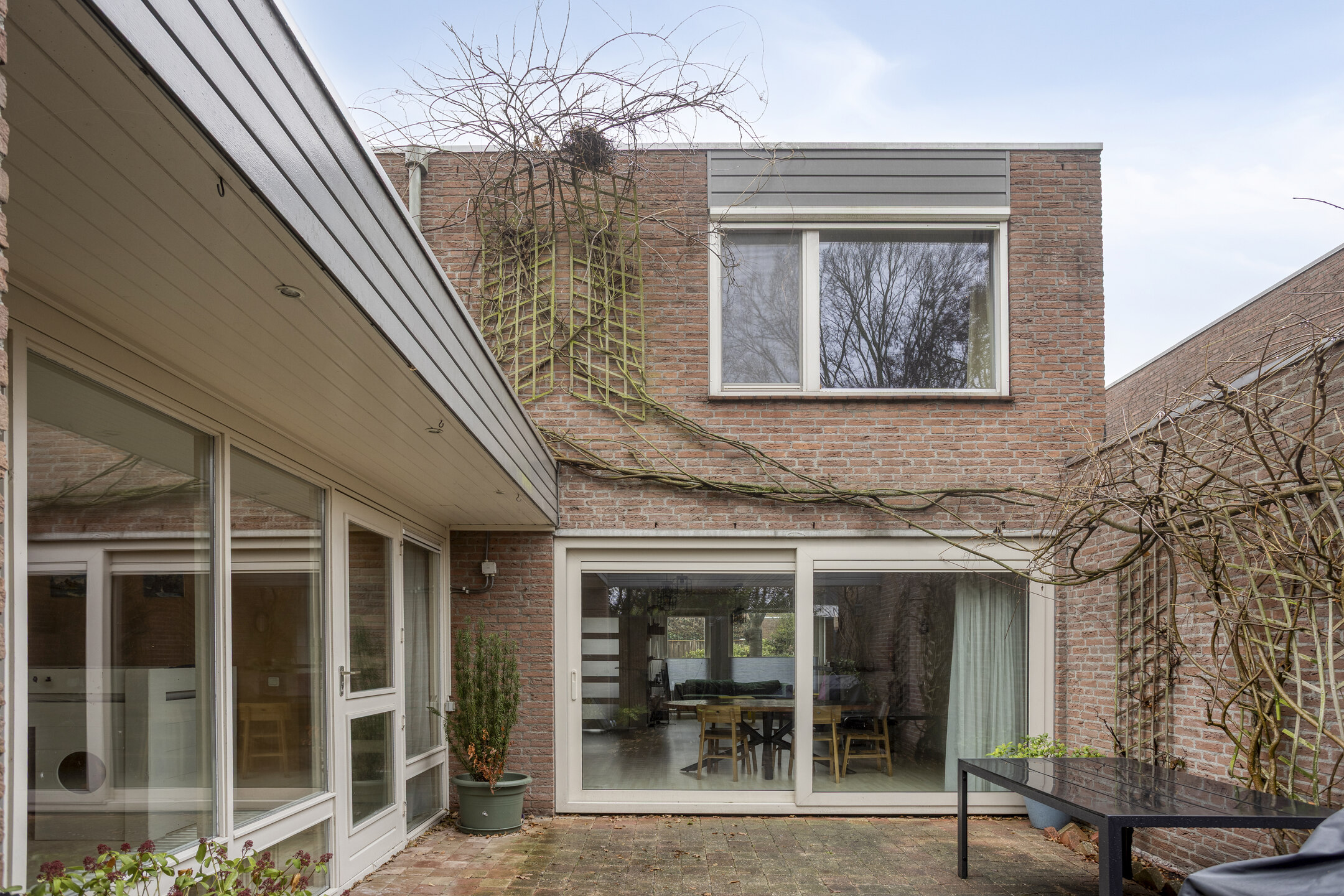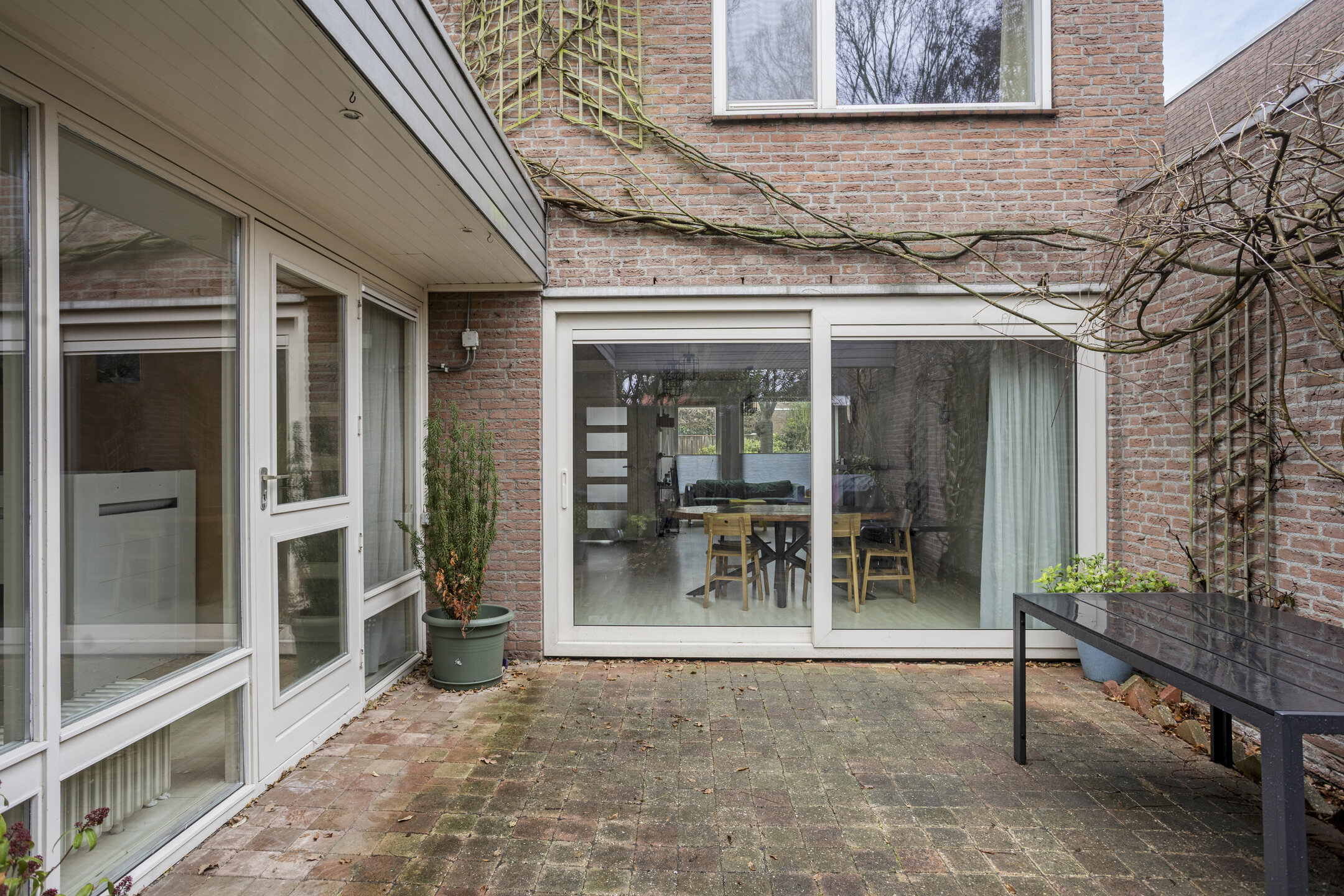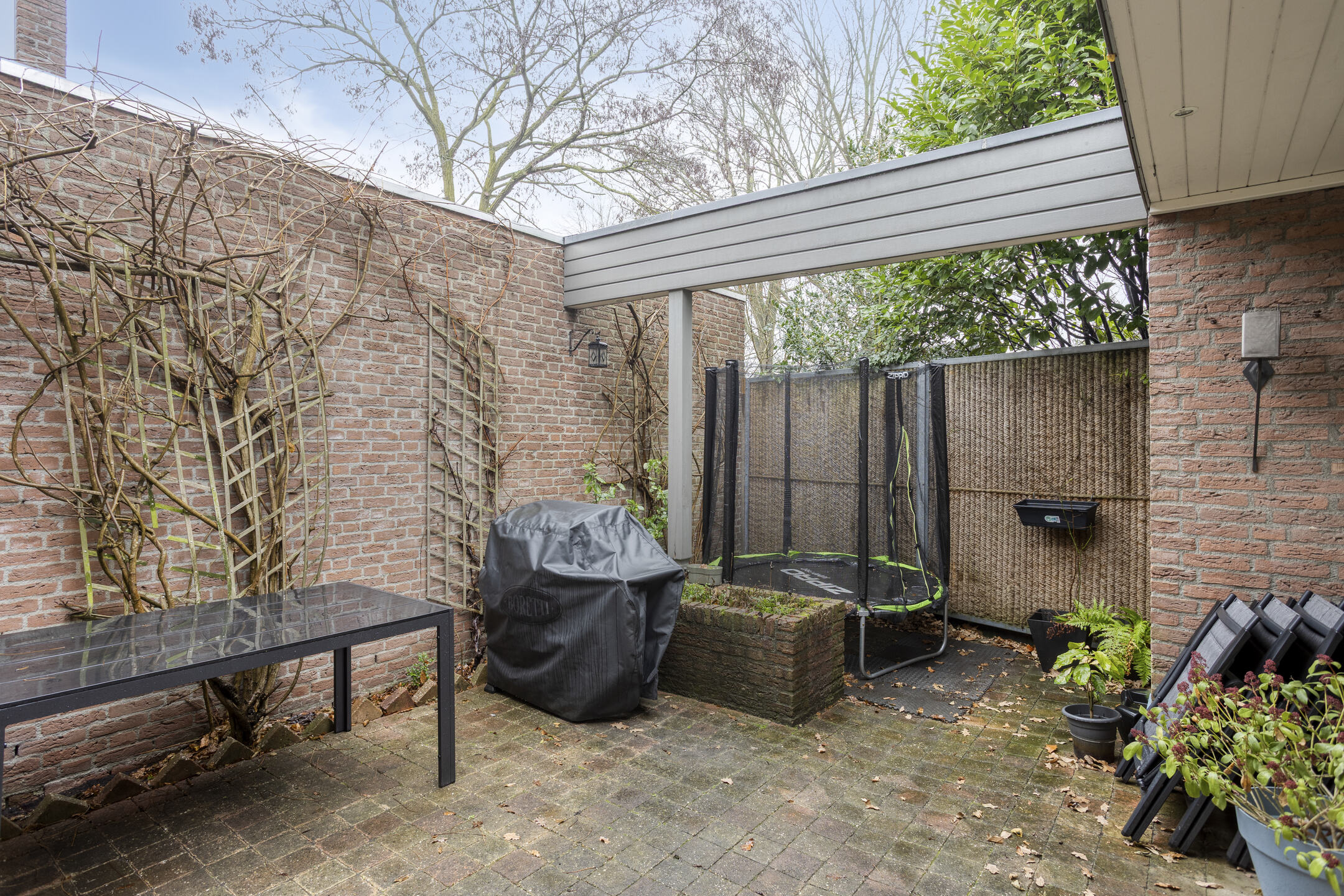 Doordat deze overdekt is, geeft dit mogelijkheden om een sfeervolle binnentuin t creeeren waar je ’s zomers en ’s winters van kunt genieten. Vanaf de patio is tevens de berging bereikbaar. Deze ruimte zou ook eventueel als uitbouw van de woning gebruikt kunnen worden, of voor eventueel een badkamer of extra ruimte op de begane grond.