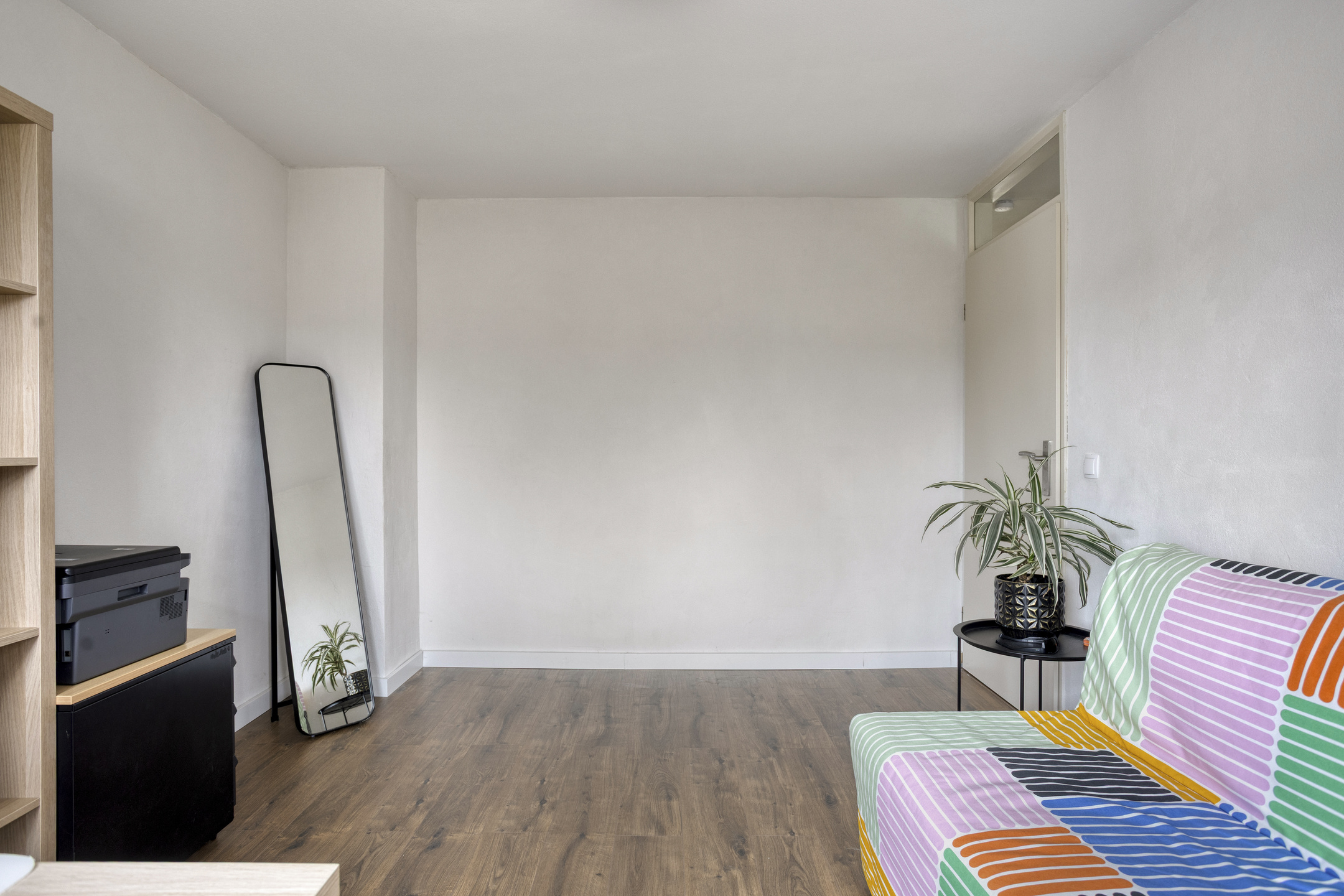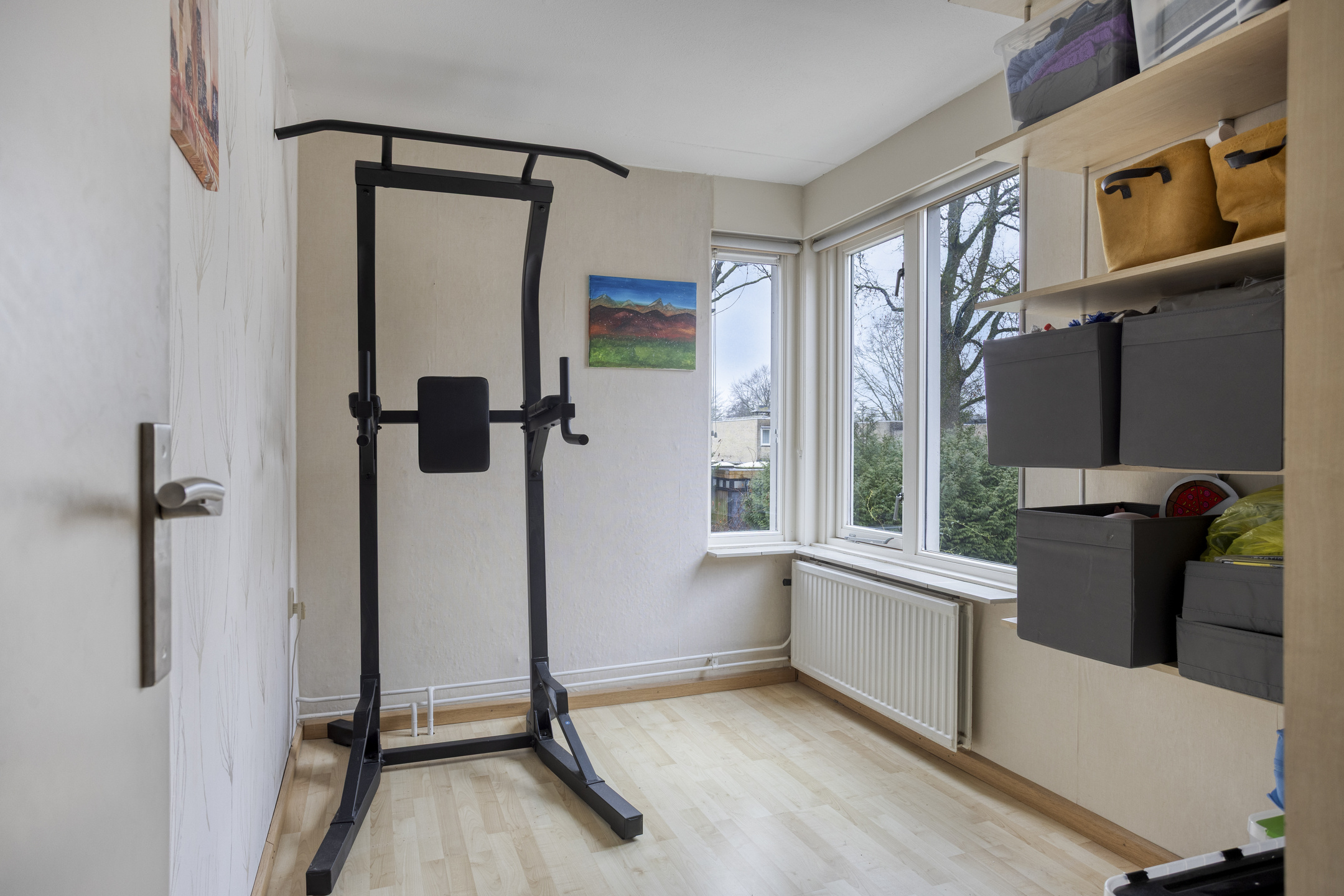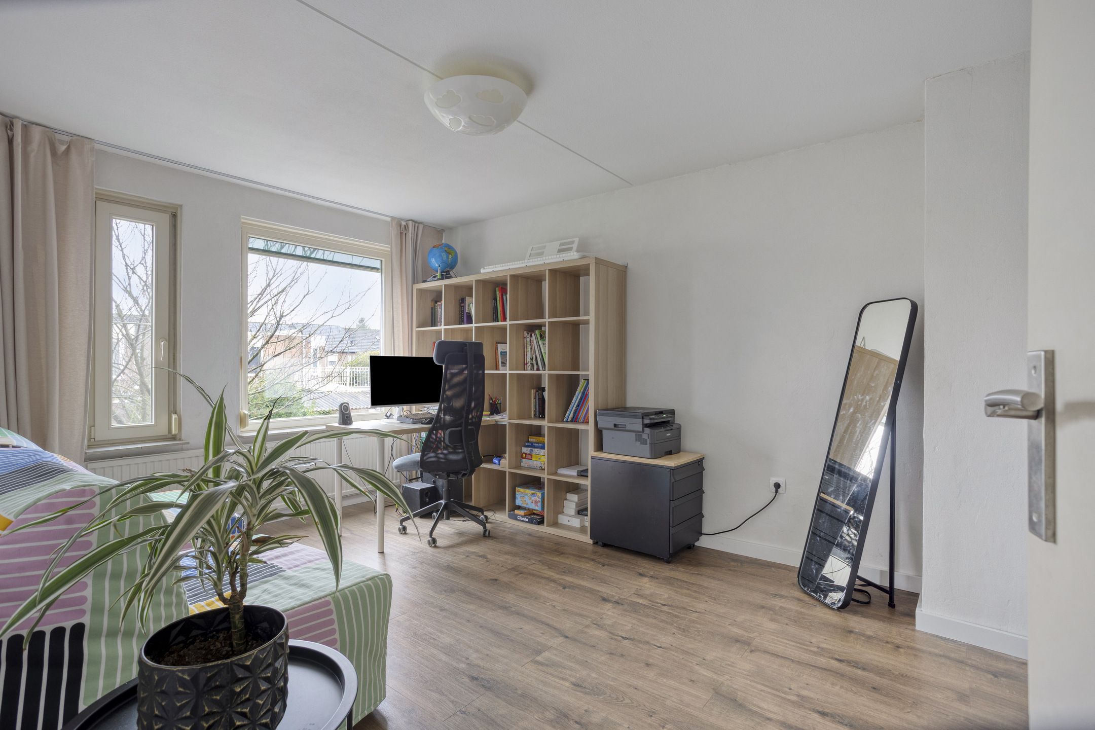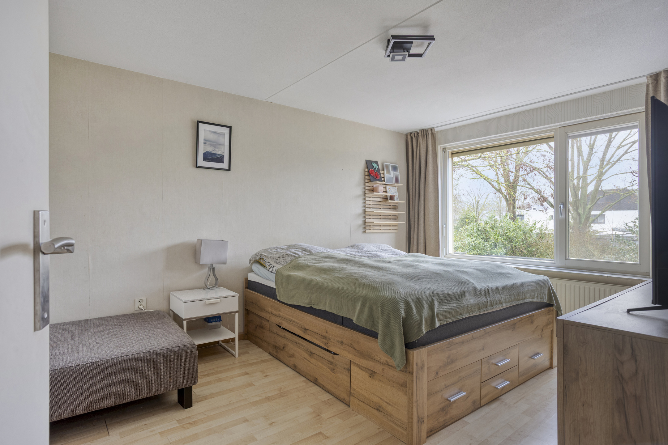 Een grote slaapkamer ligt aan de voorzijde van de woning en kijkt uit over straat.