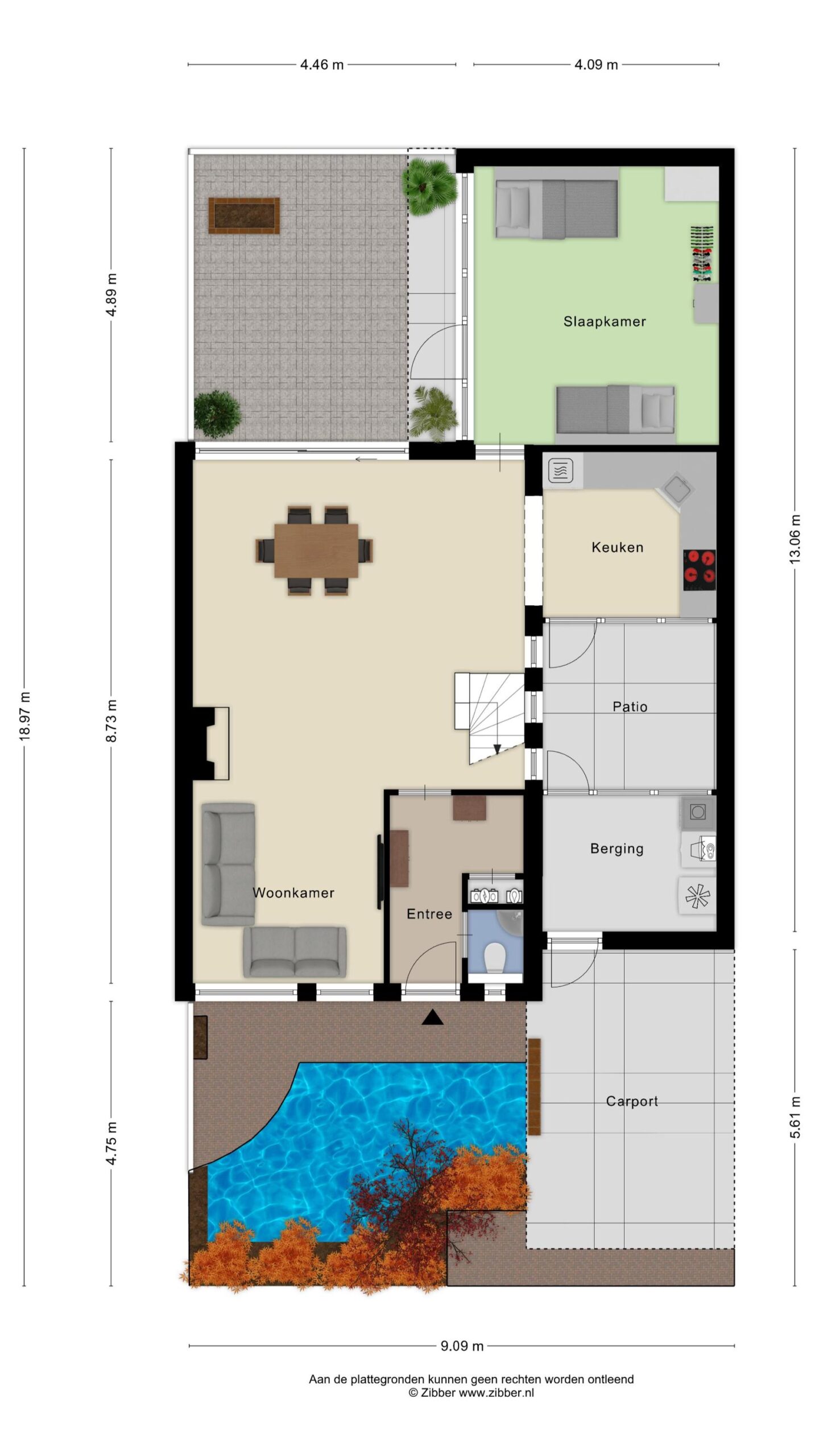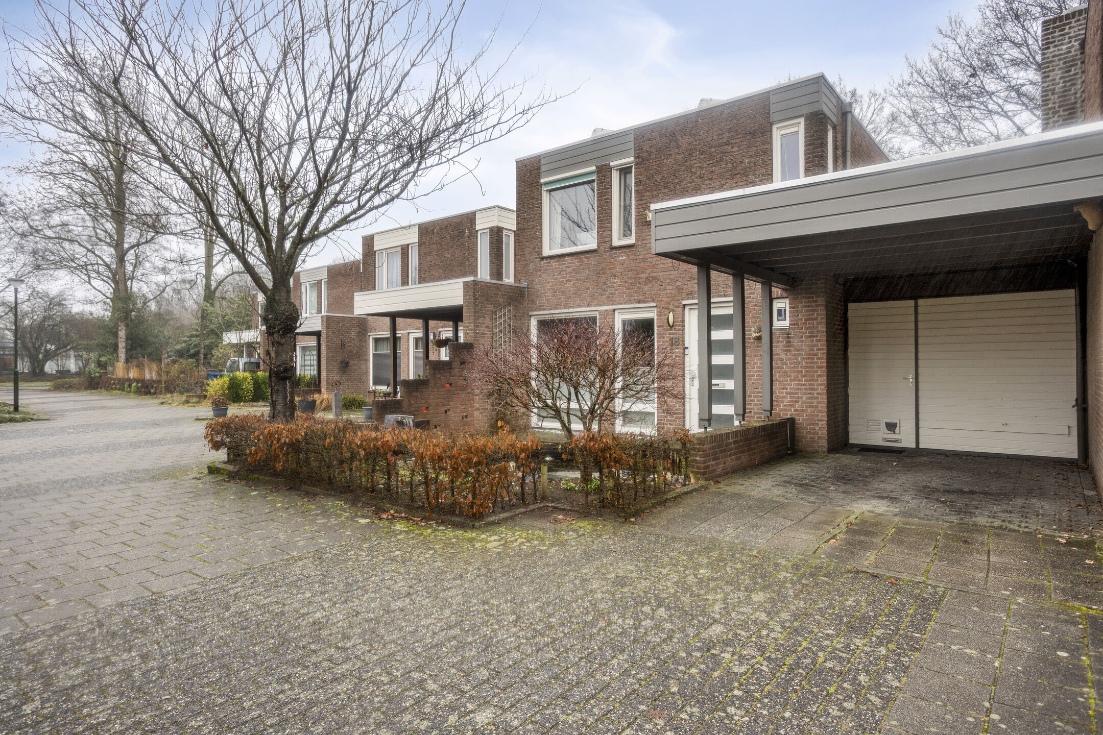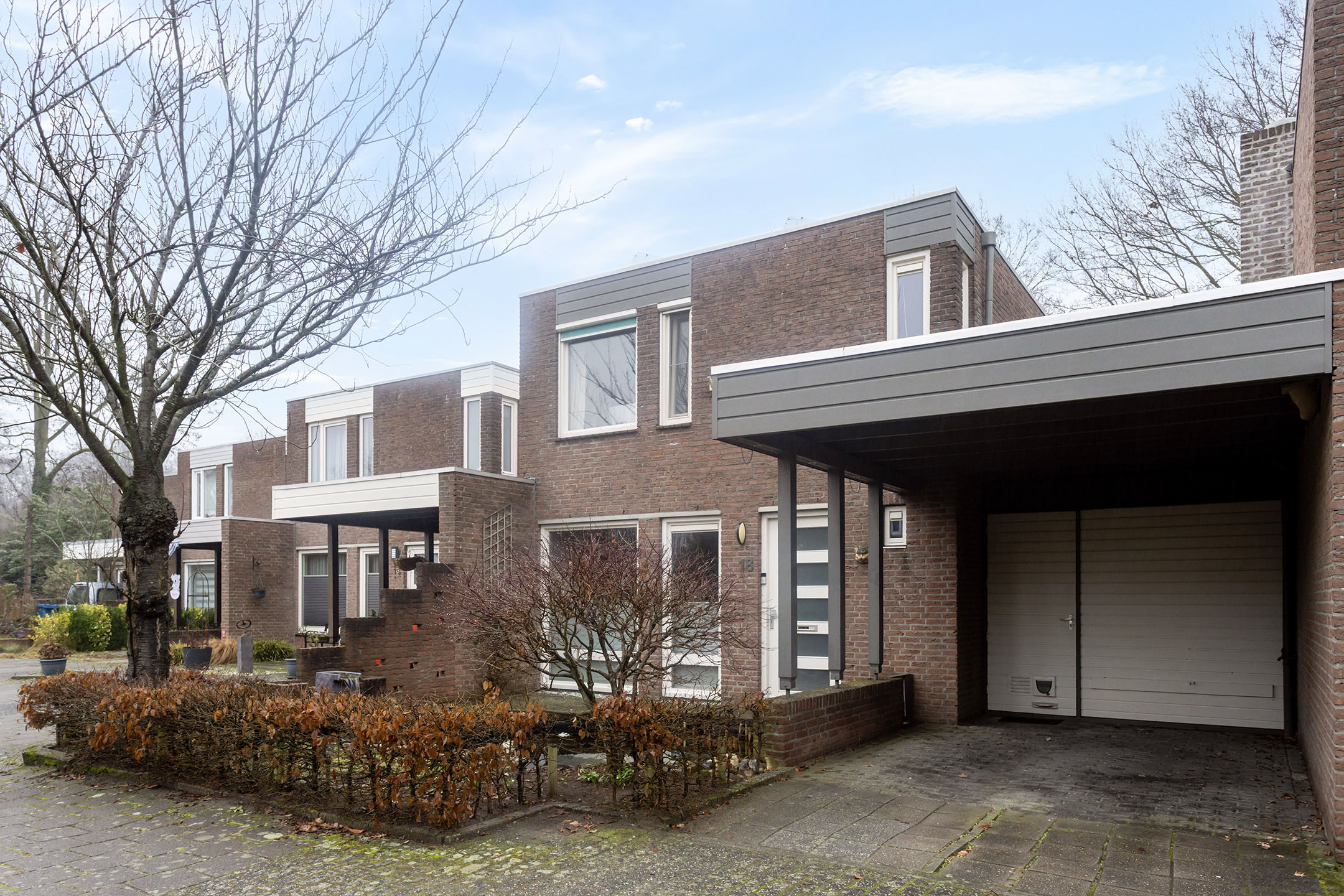 Vanaf de voorzijde van de woning kom je via de ruime oprit met carport, langs de vijverpartij af, uit bij de ingang van de woning. Maar tevens bij de berging met de aansluitingen voor de wasapparatuur, opstelling cv en de unit voor de zonnepanelen.
