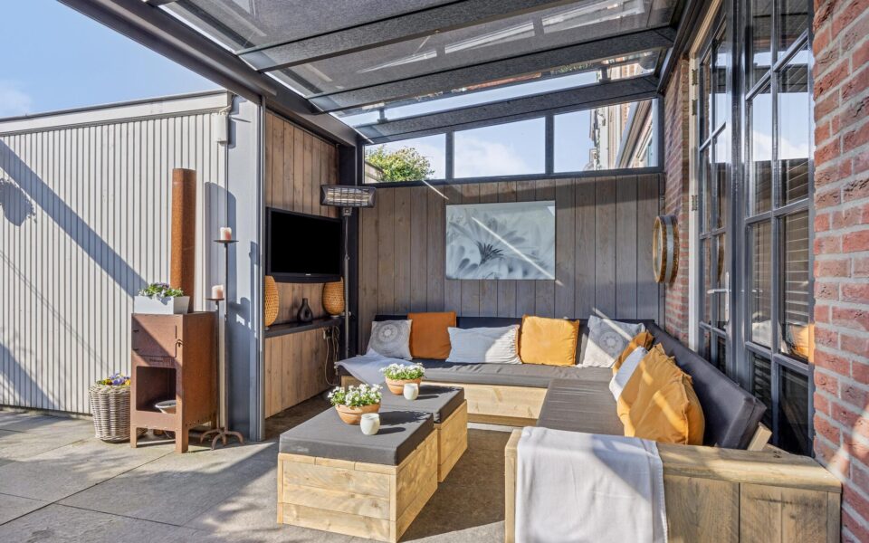 Sfeervolle achtertuin gelegen op het zuidwesten met luxe overkapping met zonnescreen over de overkapping heen. Daarnaast ook nog een verticale zon-/windscreen. Dit geeft bij een beetje zon al een heerlijke en gezellige loungehoek en is een verlenging van de woonkamer.