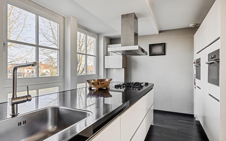 Een moderne keuken (2017) kijkt aan de voorzijde van de woning uit over de Ecozone met groen en water. Een fantastisch uitzicht wat koken toch gezelliger maakt. Een royaal eiland welke voorzien is van een 5-pits gaskookplaat, afzuigkap, spoelbak en voldoende opbergkasten over de gehele achterzijde van het eiland. In de kastenwand bevindt zich de apparatuur zoals de oven, combi-oven, vaatwasser, koelkast en vriezer.