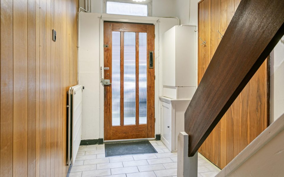Binnenkomst in de hal met meterkast en trapopgang naar de 1e verdieping. Direct valt je de hoge plafonds en het ruimtelijke aspect hierdoor op. Vanuit de hal kun je naar woonkamer of de keuken.