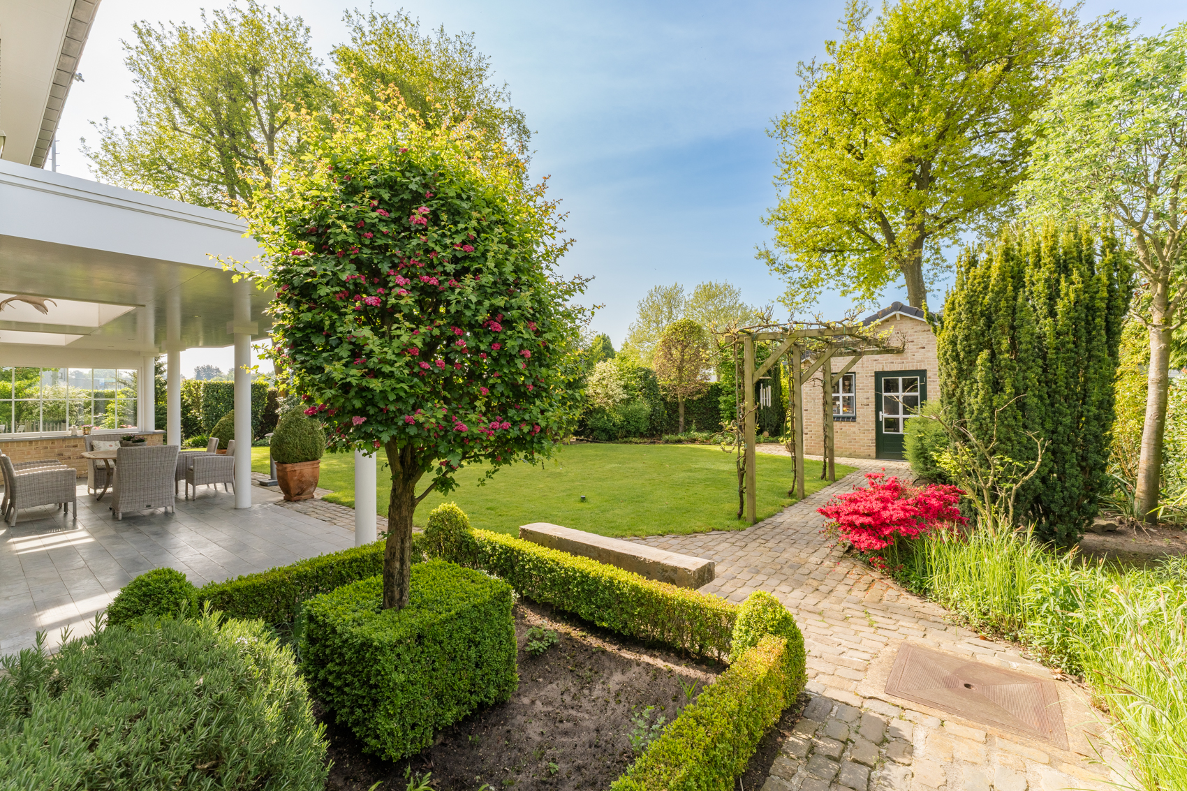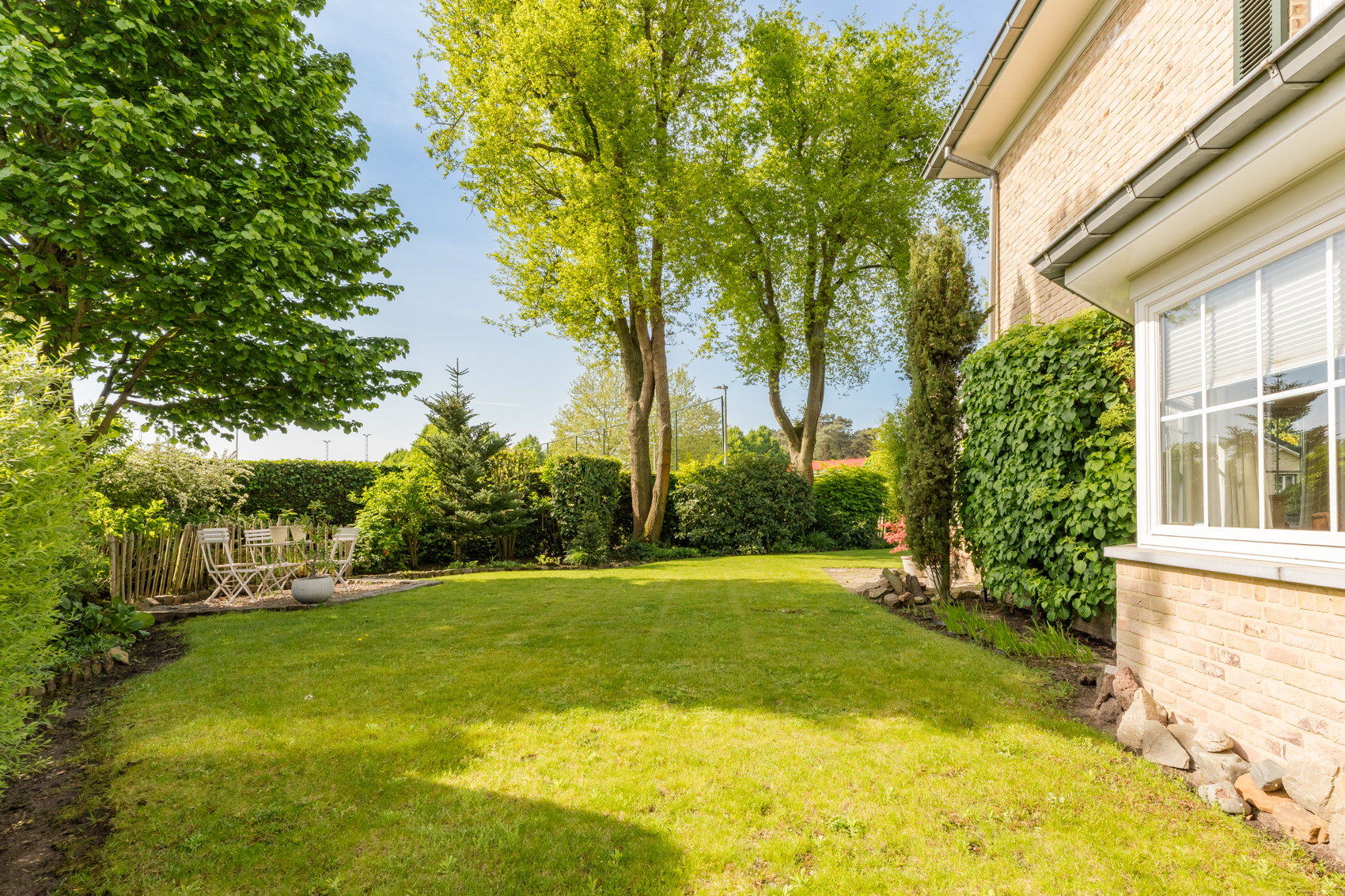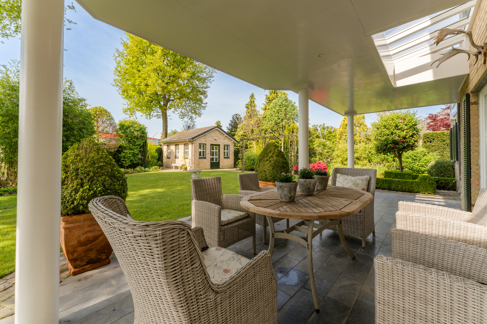 Tevens is er een ruim tuinhuis met veel opbergmogelijkheden, maar ook met voorzieningen om er bijvoorbeeld een atelier, fitness of wellness van te maken. Het tuinhuis herbergt een automatische beregeningsinstallatie op grondwater met 4 circuits voor alle tuingedeeltes. Het groen in de voor- en zijtuin wordt automatisch ‘s avonds mooi verlicht tot aan de voordeur.