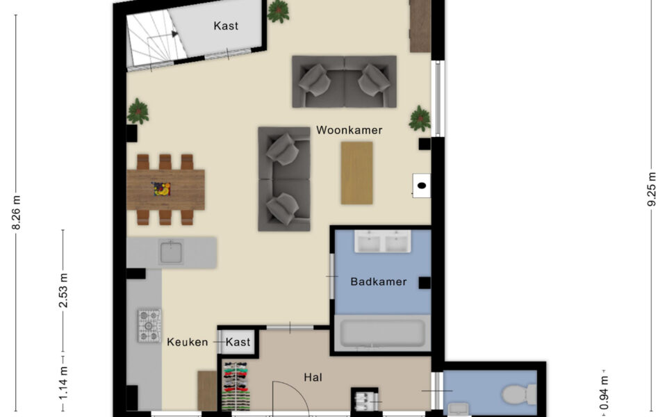 Kom binnen in een lichte, brede hal met garderobe, meterkast en toilet.