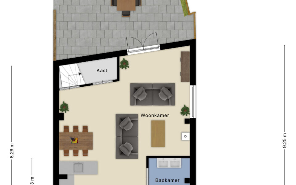 Een sfeervolle woonkamer geeft een ruimtelijke impressie door het hoge plafond. De geïsoleerde schoorsteenpijp maakt het mogelijk om een houthaard aan te sluiten, wat nog meer ambiance aan het geheel geeft. Openslaande tuindeuren geven toegang tot de gezellige stadstuin. De trapkast biedt ruimte voor de wasmachine en opstelling van de cv.