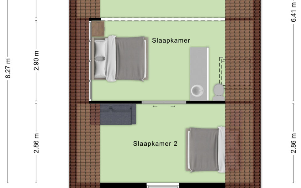 Op de verdieping bevinden zich 2 slaapkamers. De 1e slaapkamer betreft een ruime slaapkamer met dakkapel, wastafel en 2e toilet (sanibroyeur). Met plafond dat tot in de nok toe doorloopt, geeft dit een hele ruimtelijke impressie.