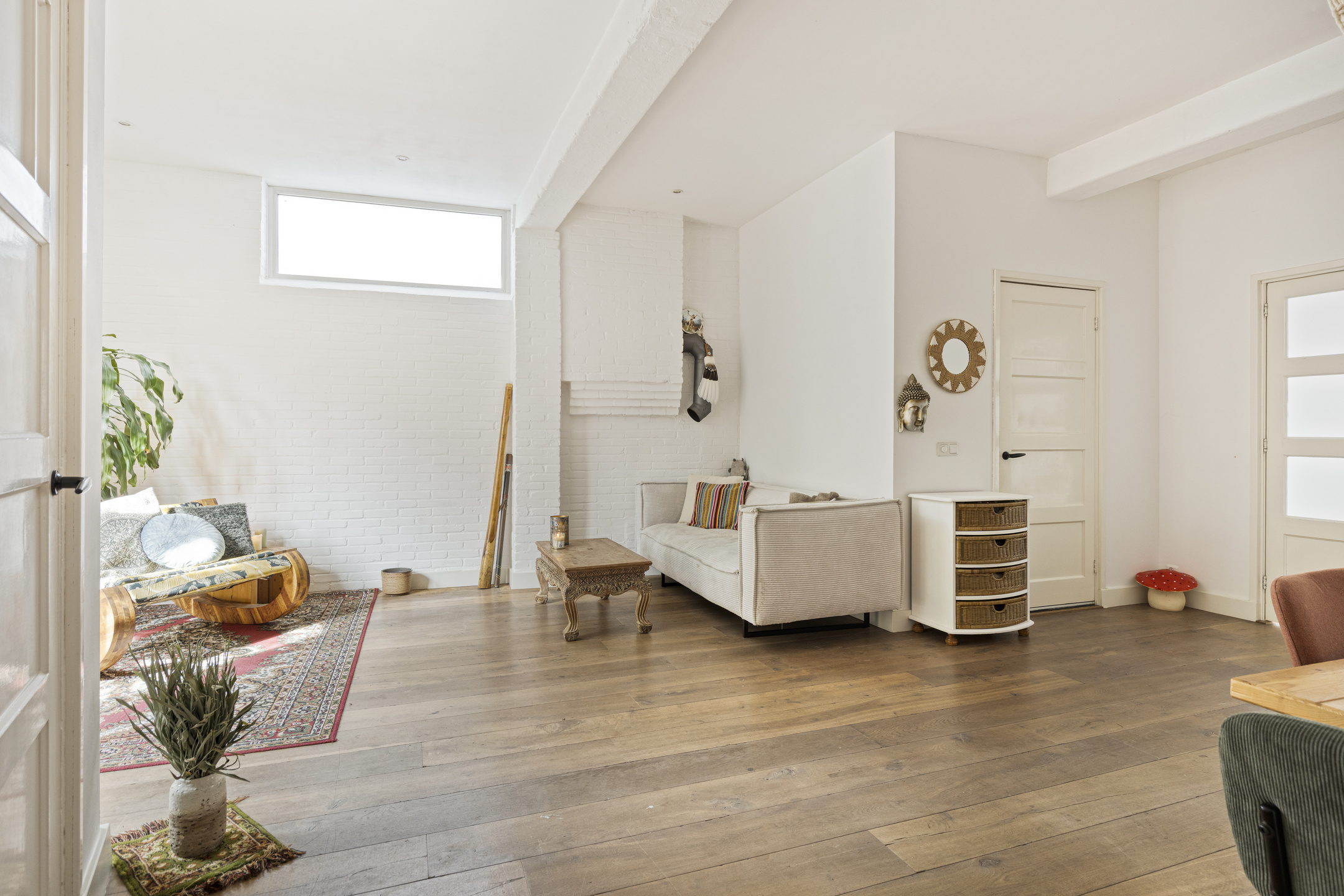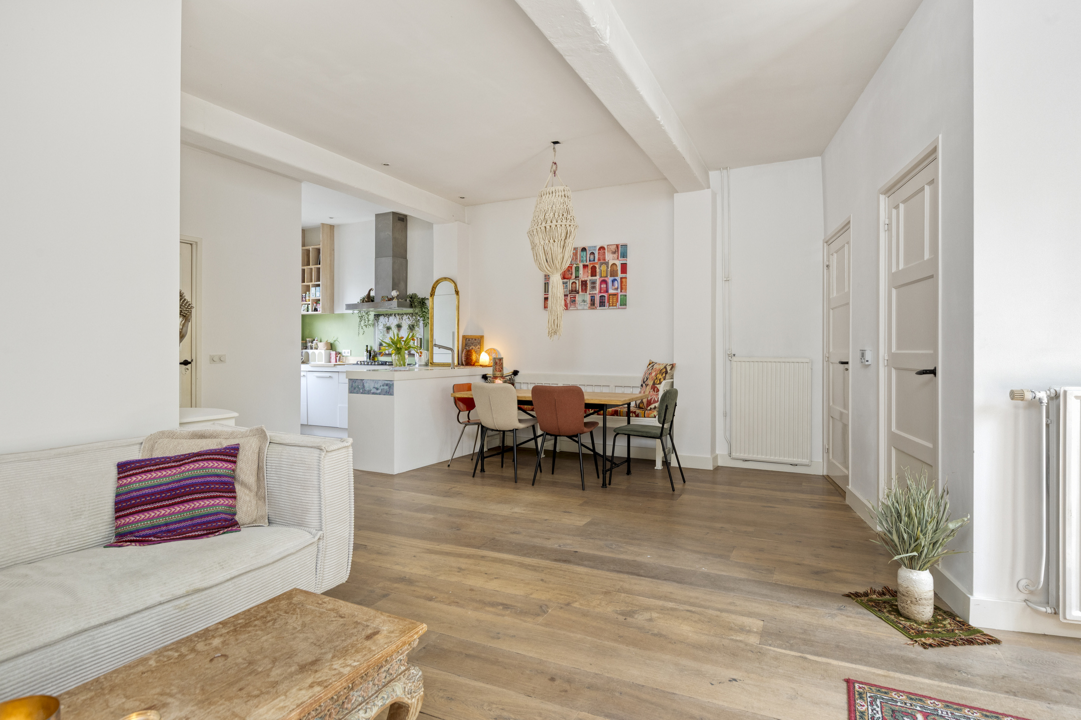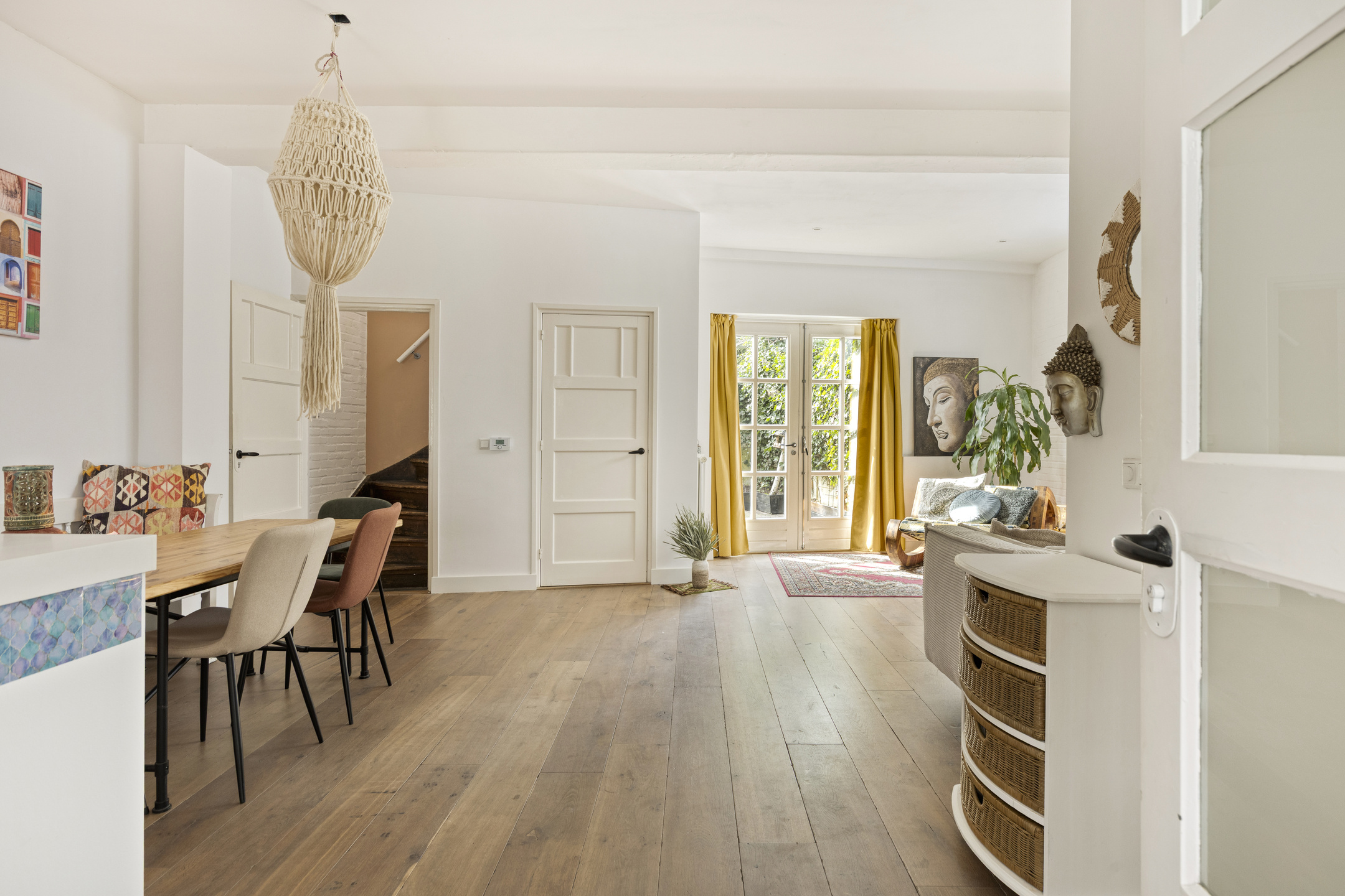 Een sfeervolle woonkamer geeft een ruimtelijke impressie door het hoge plafond. De geïsoleerde schoorsteenpijp maakt het mogelijk om een houthaard aan te sluiten, wat nog meer ambiance aan het geheel geeft. Openslaande tuindeuren geven toegang tot de gezellige stadstuin. De trapkast biedt ruimte voor de wasmachine en opstelling van de cv.