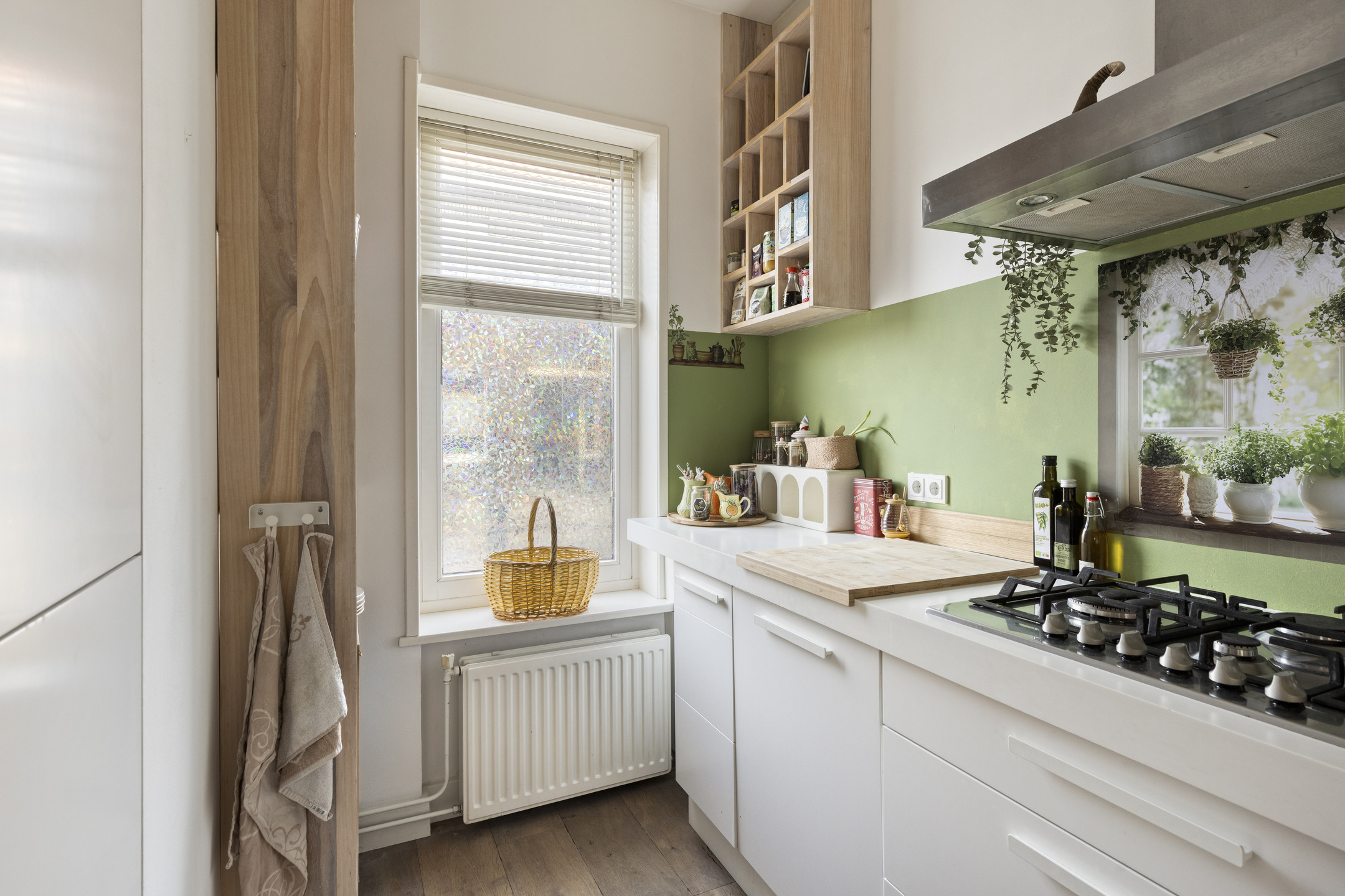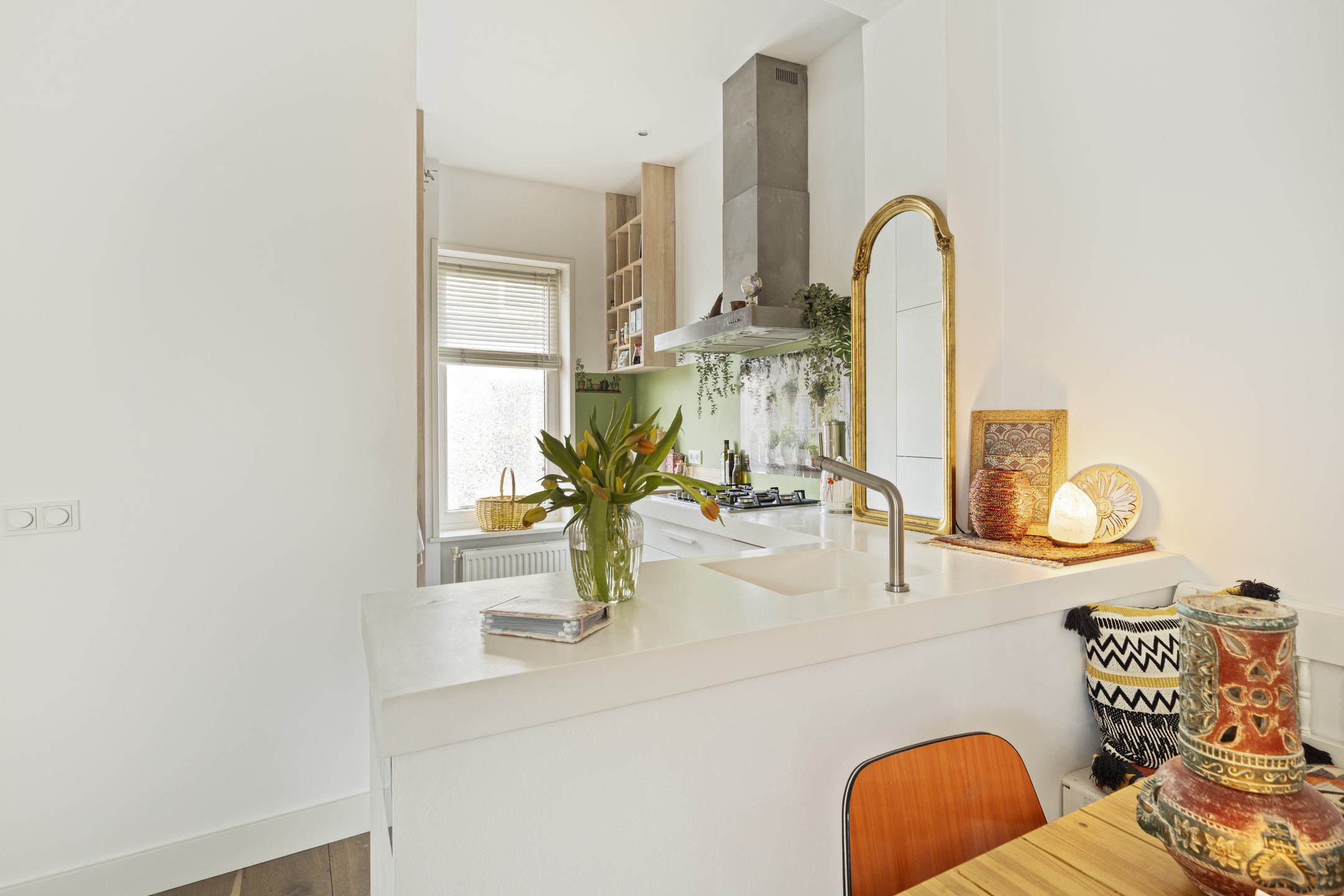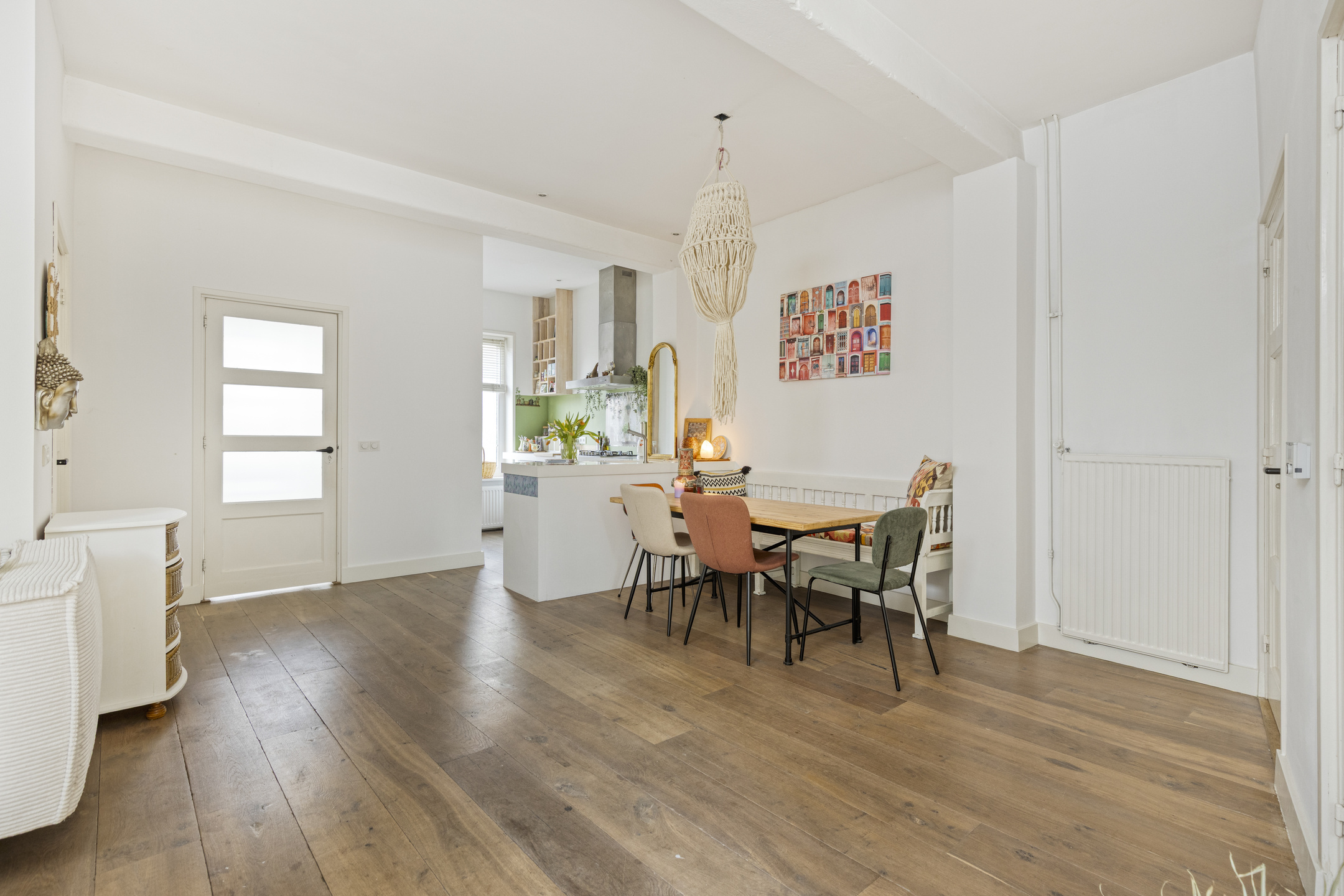 Een sfeervolle woonkamer geeft een ruimtelijke impressie door het hoge plafond. De geïsoleerde schoorsteenpijp maakt het mogelijk om een houthaard aan te sluiten, wat nog meer ambiance aan het geheel geeft. Openslaande tuindeuren geven toegang tot de gezellige stadstuin. De trapkast biedt ruimte voor de wasmachine en opstelling van de cv.