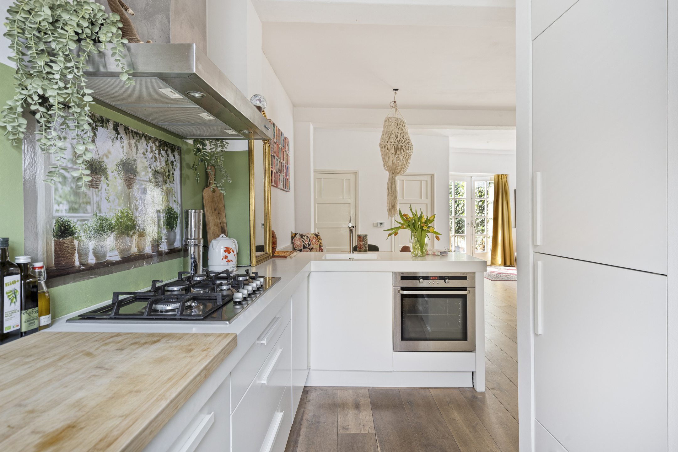 In de open keuken vind je alle gewenste apparatuur zoals een 5-pits gasfornuis met wokbrander, een afzuigkap, koelkast met aparte vriezer, oven en een vaatwasser. De hoekopstelling met het lange aanrechtblad zorgt voor veel werkruimte en maakt het mogelijk om contact met de woonkamer te blijven houden tijdens het koken.