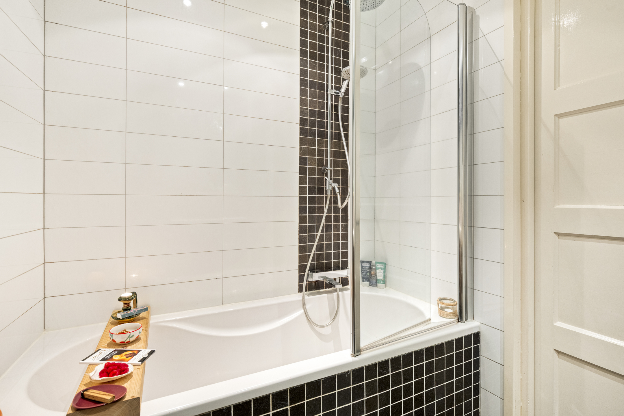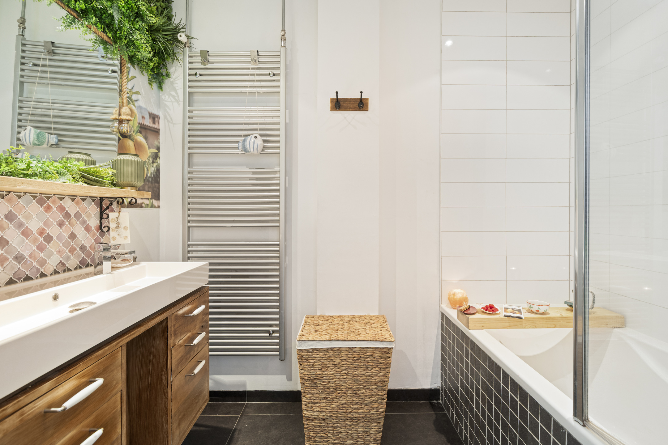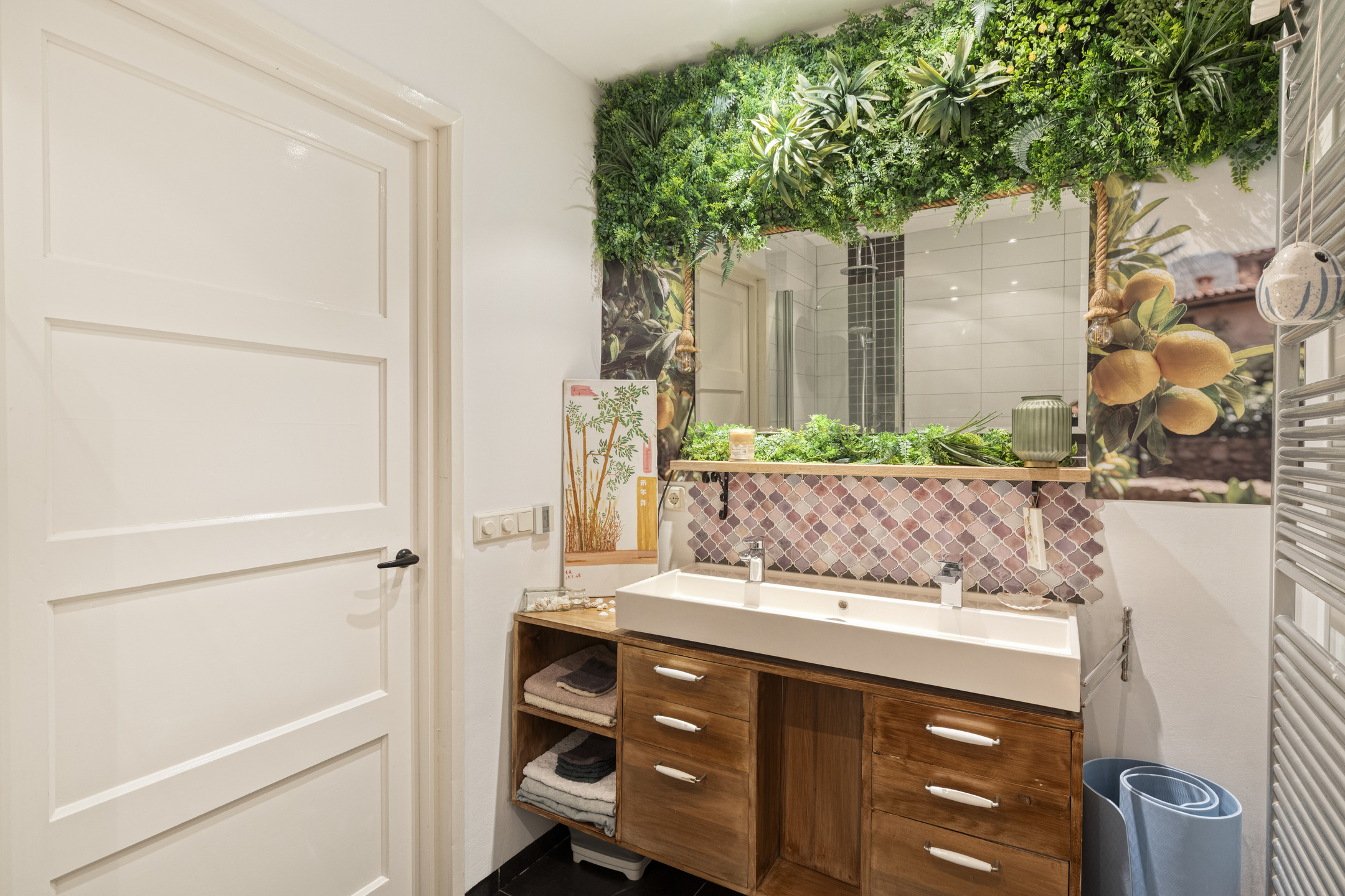 Vanuit de woonkamer is de moderne badkamer toegankelijk. Deze is voorzien van een duo-ligbad met douche en regendouche, tevens een badkamermeubel met brede wastafel. Een designradiator en elektrische vloerverwarming zorgen ervoor dat het hier aangenaam warm blijft.