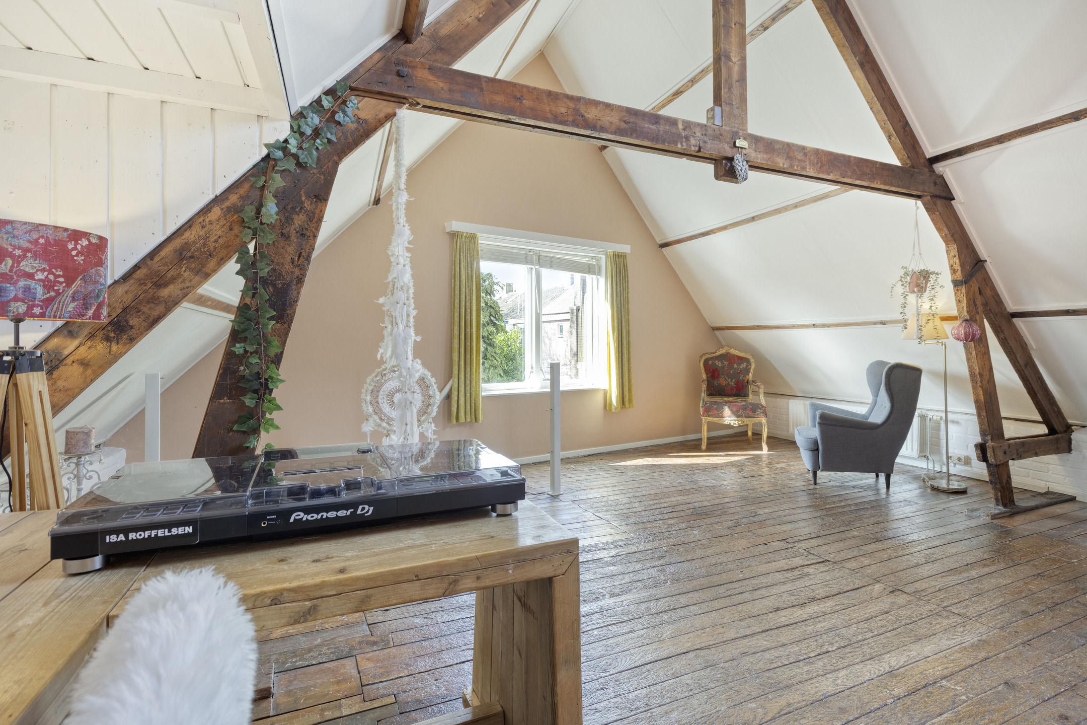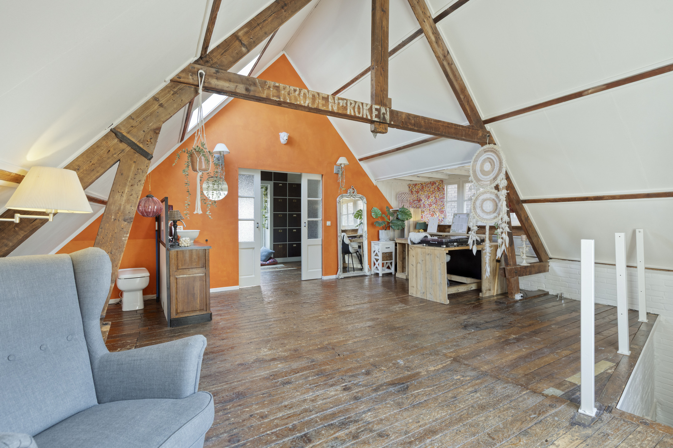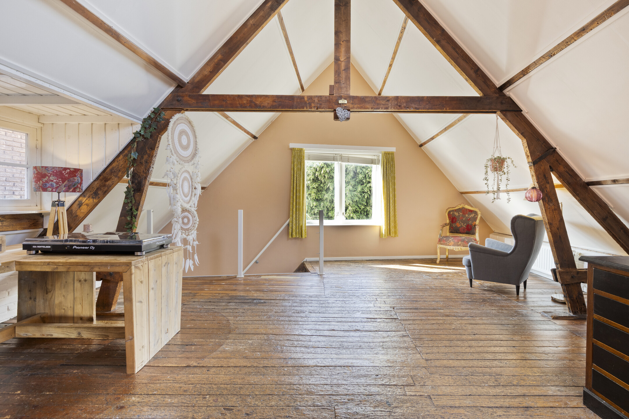 De 1e verdieping is middels een vaste trap bereikbaar. Op deze verdieping vindt je nog een stuk historie van het voormalige timmerfabriekje terug via de balkenconstructie en originele houten vloer en trap.