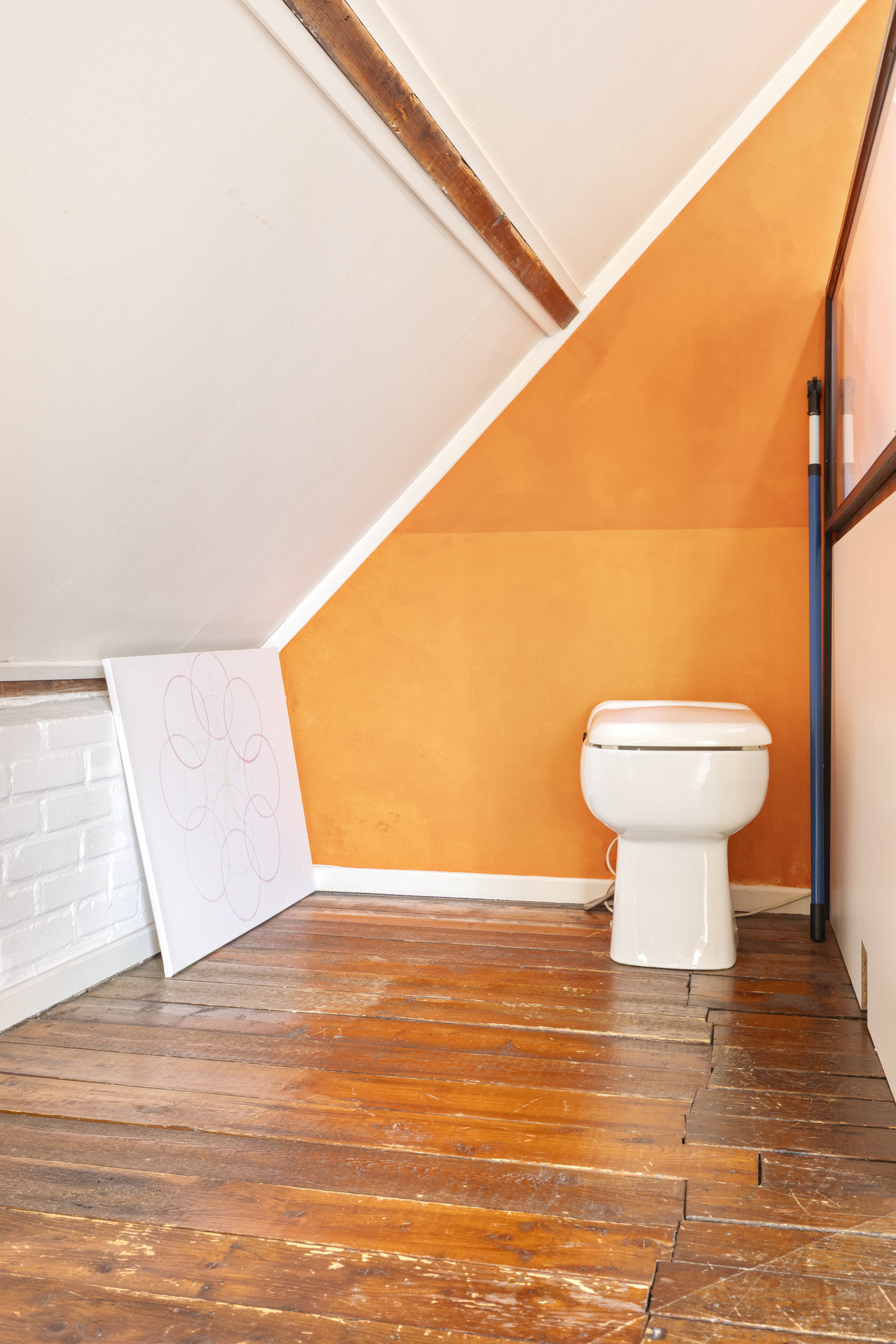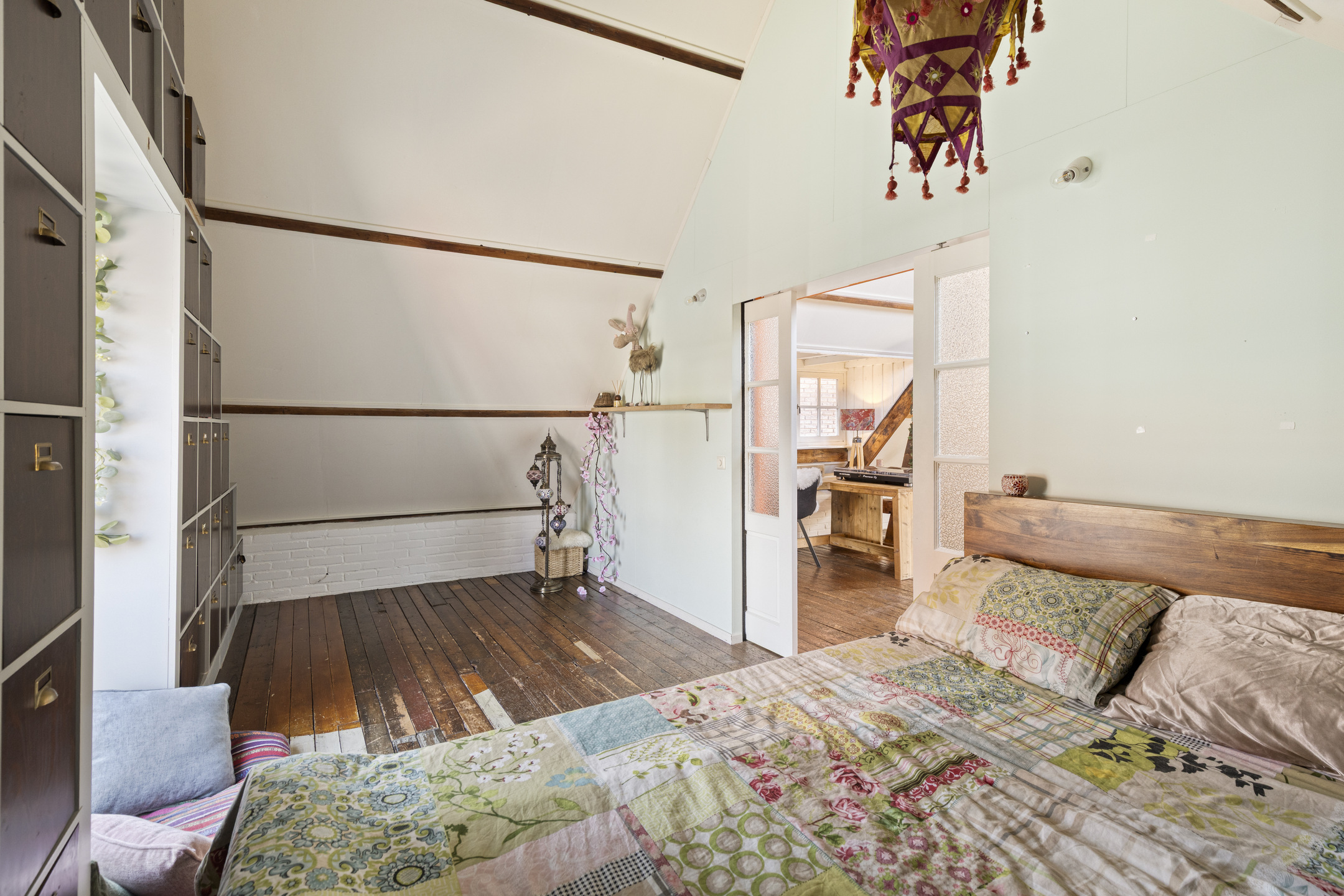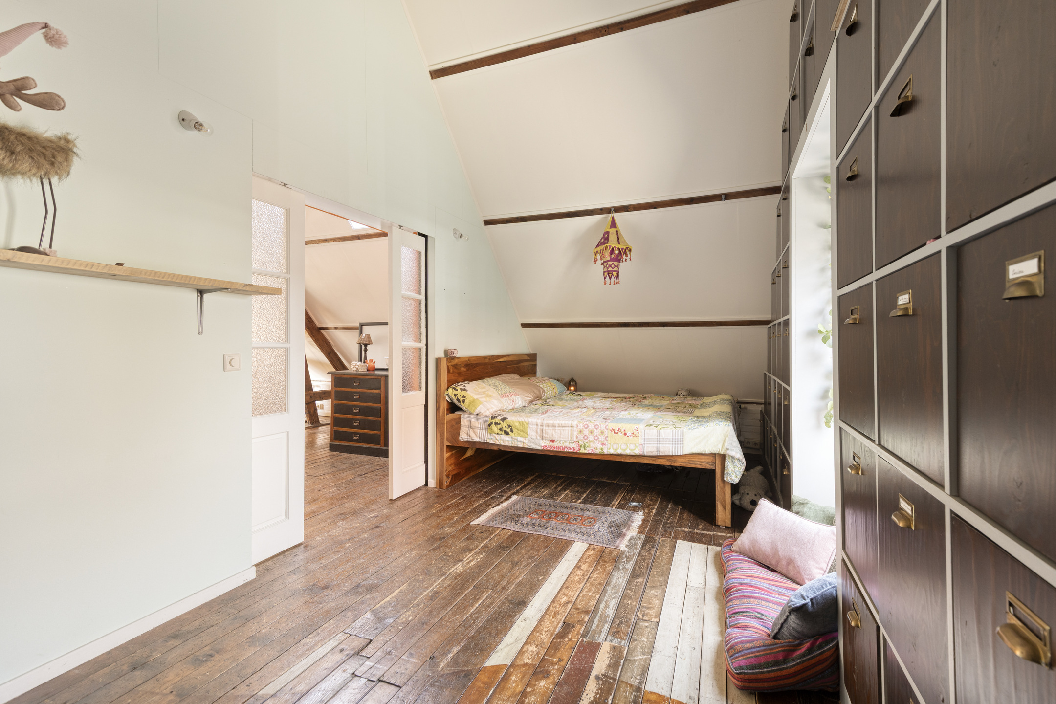 De 1e verdieping is middels een vaste trap bereikbaar. Op deze verdieping vindt je nog een stuk historie van het voormalige timmerfabriekje terug via de balkenconstructie en originele houten vloer en trap.