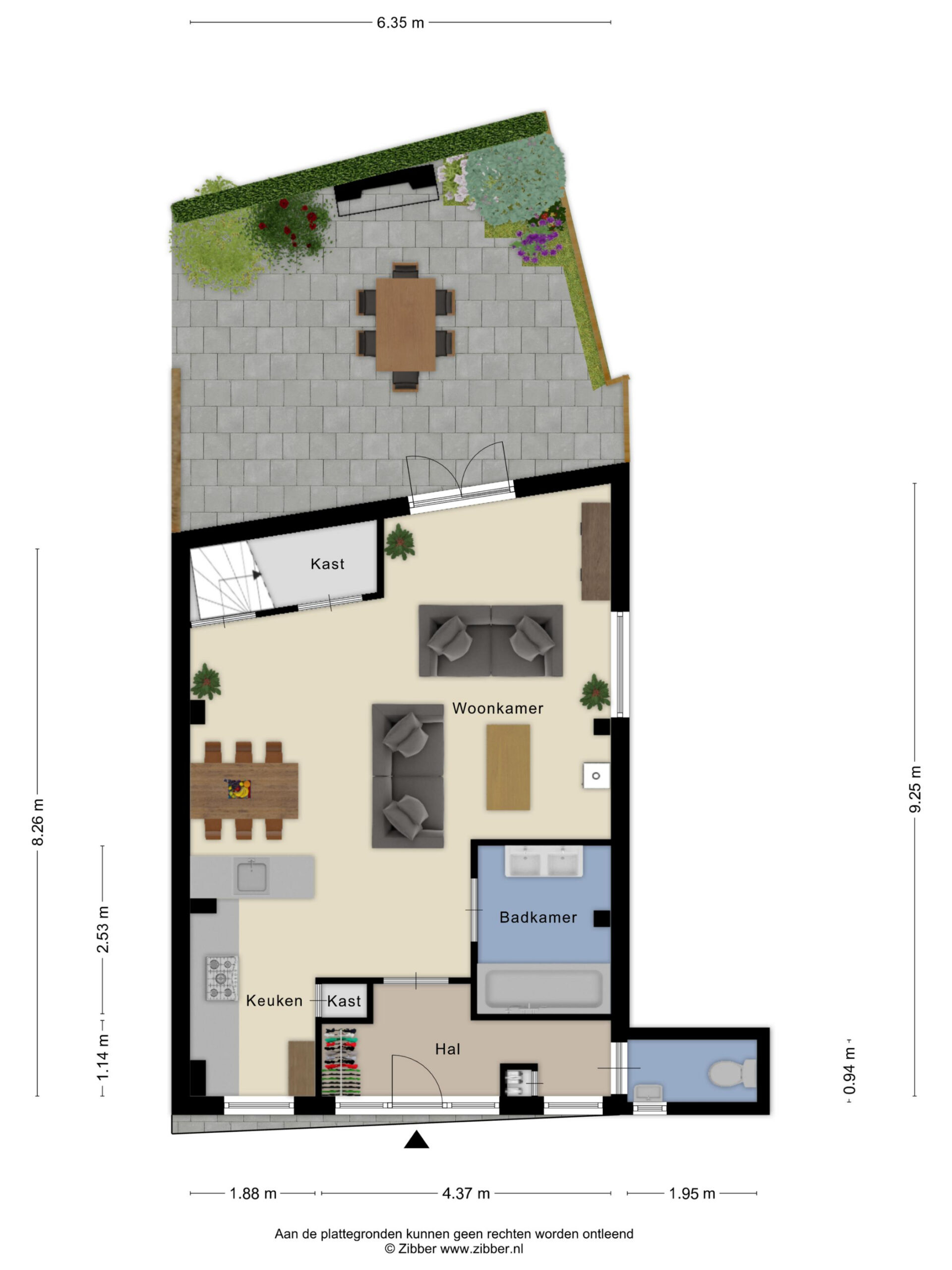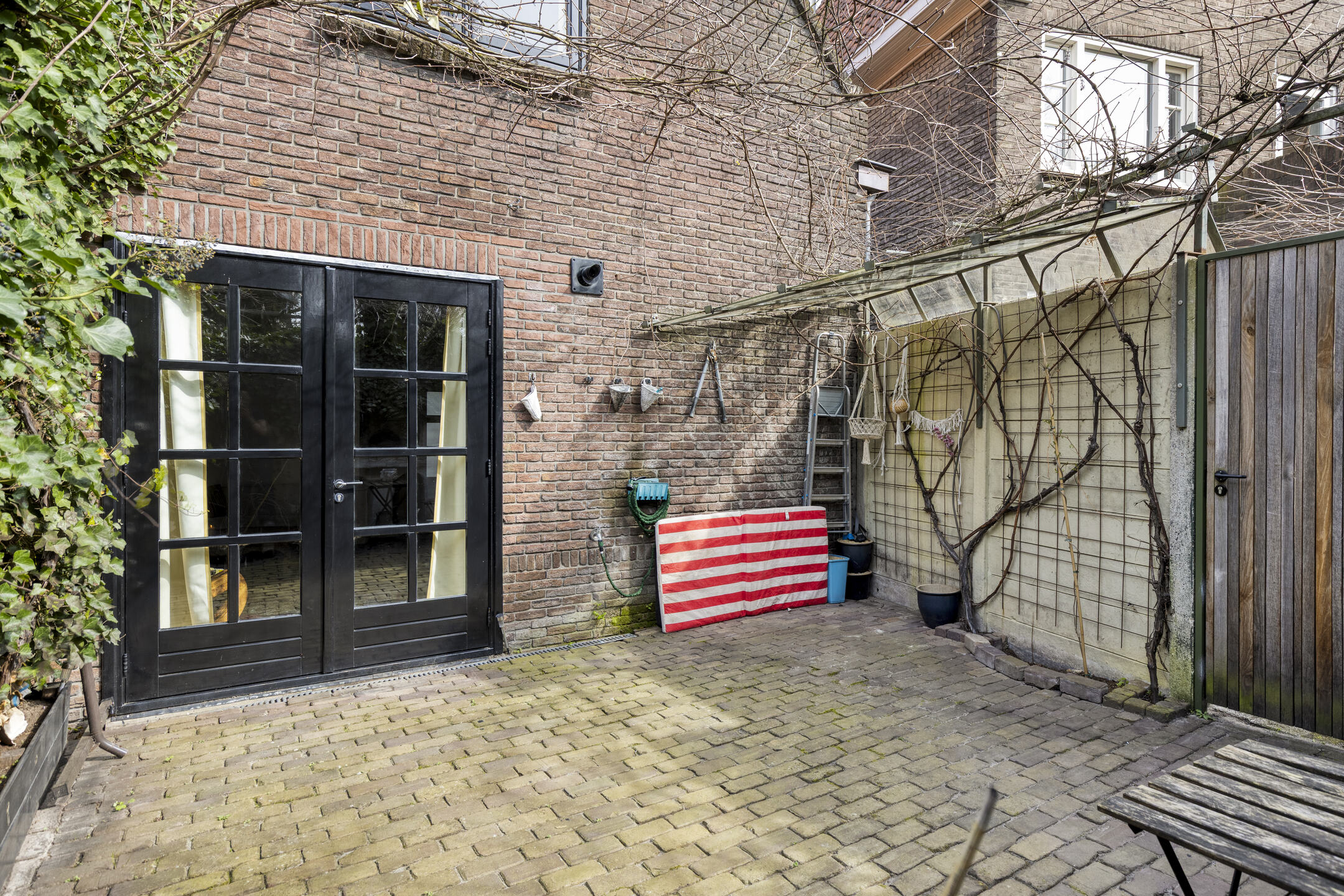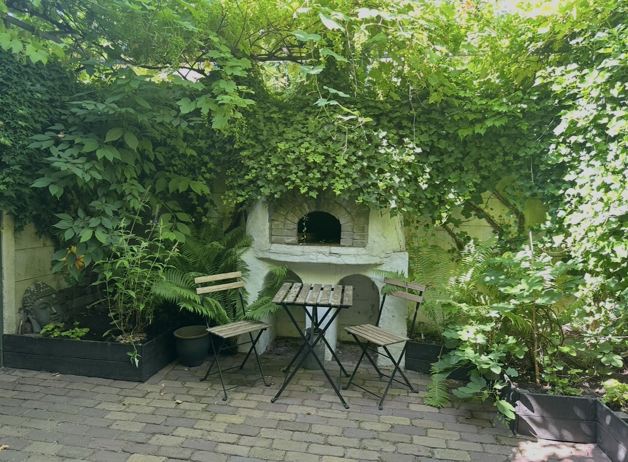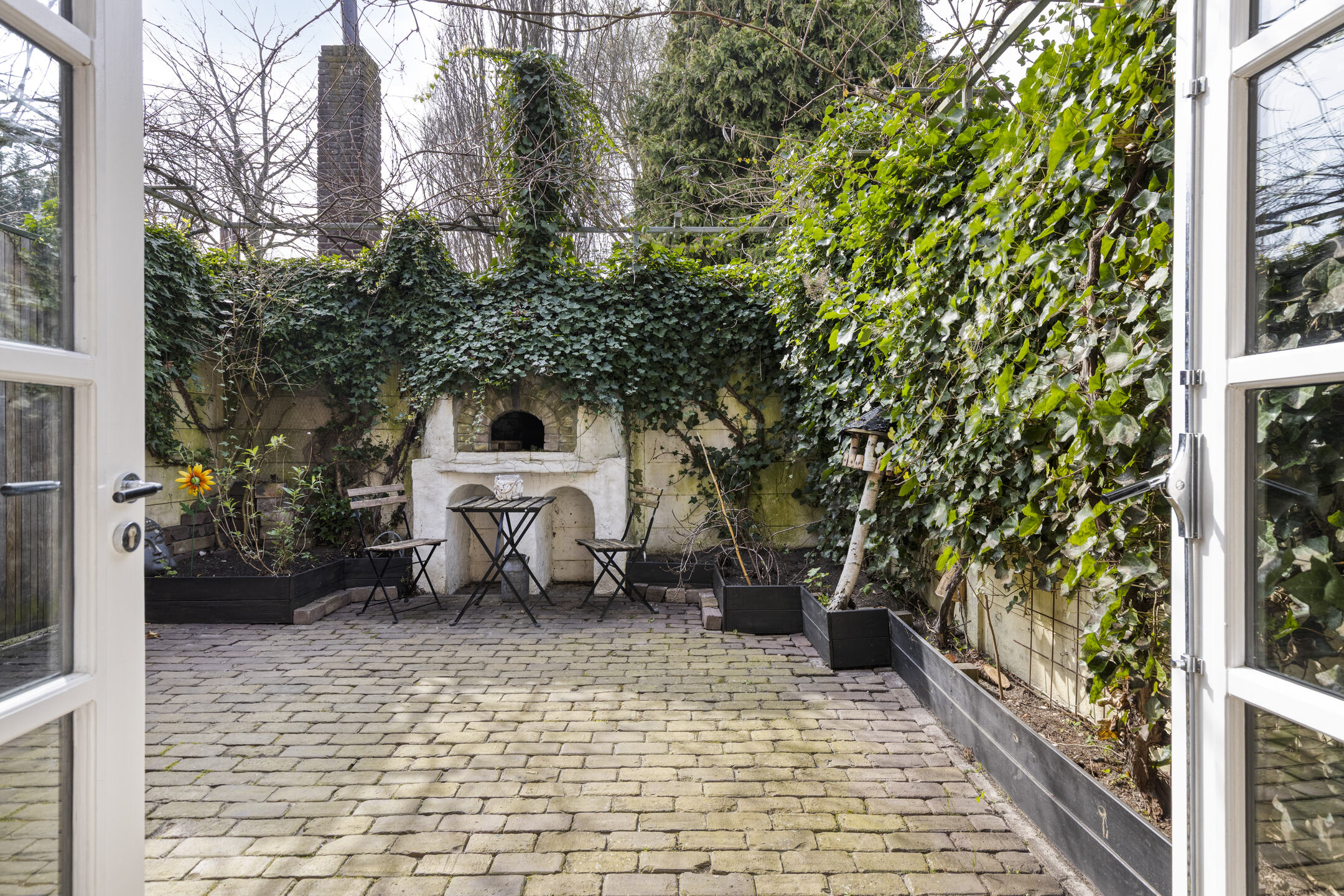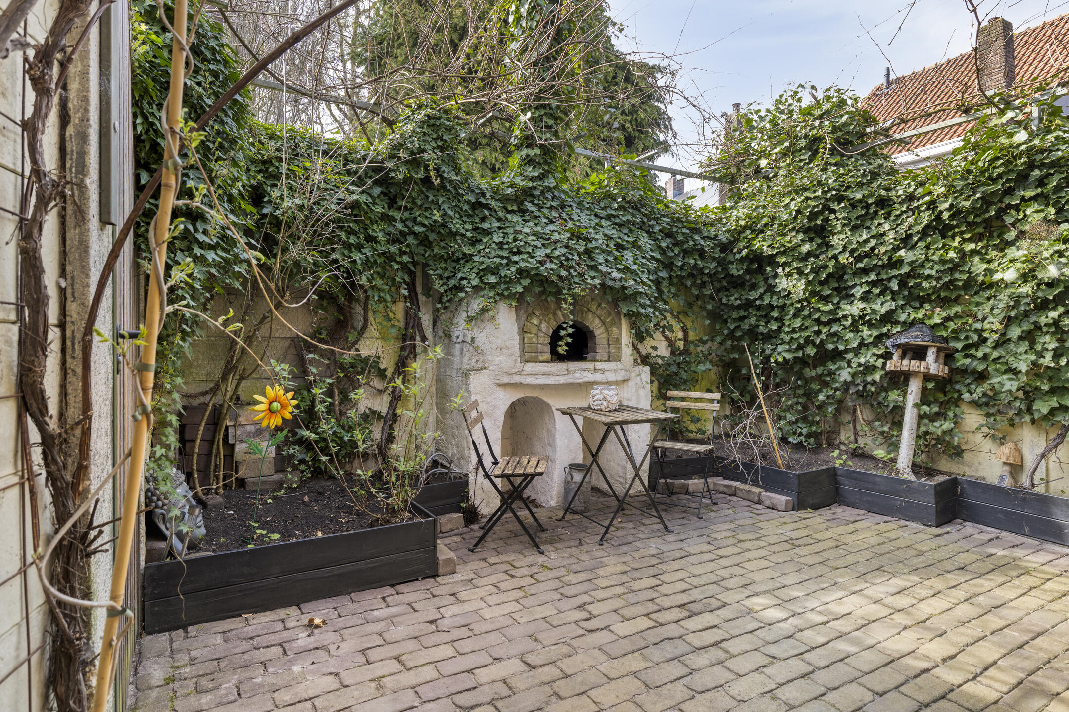 Een gezellige stadstuin. In de zomer een groen aanzicht door de klimplanten en plantenborders. De druivenranken zorgen voor schaduw. Door middel van een stenen pizzaoven, kan er gezellige vertoeft en gegeten worden in deze tuin. Het afdakje is perfect om de tuinstoelen of een fiets droog weg te kunnen zetten, de woning is immers achterom bereikbaar via het gangetje naast de woning.