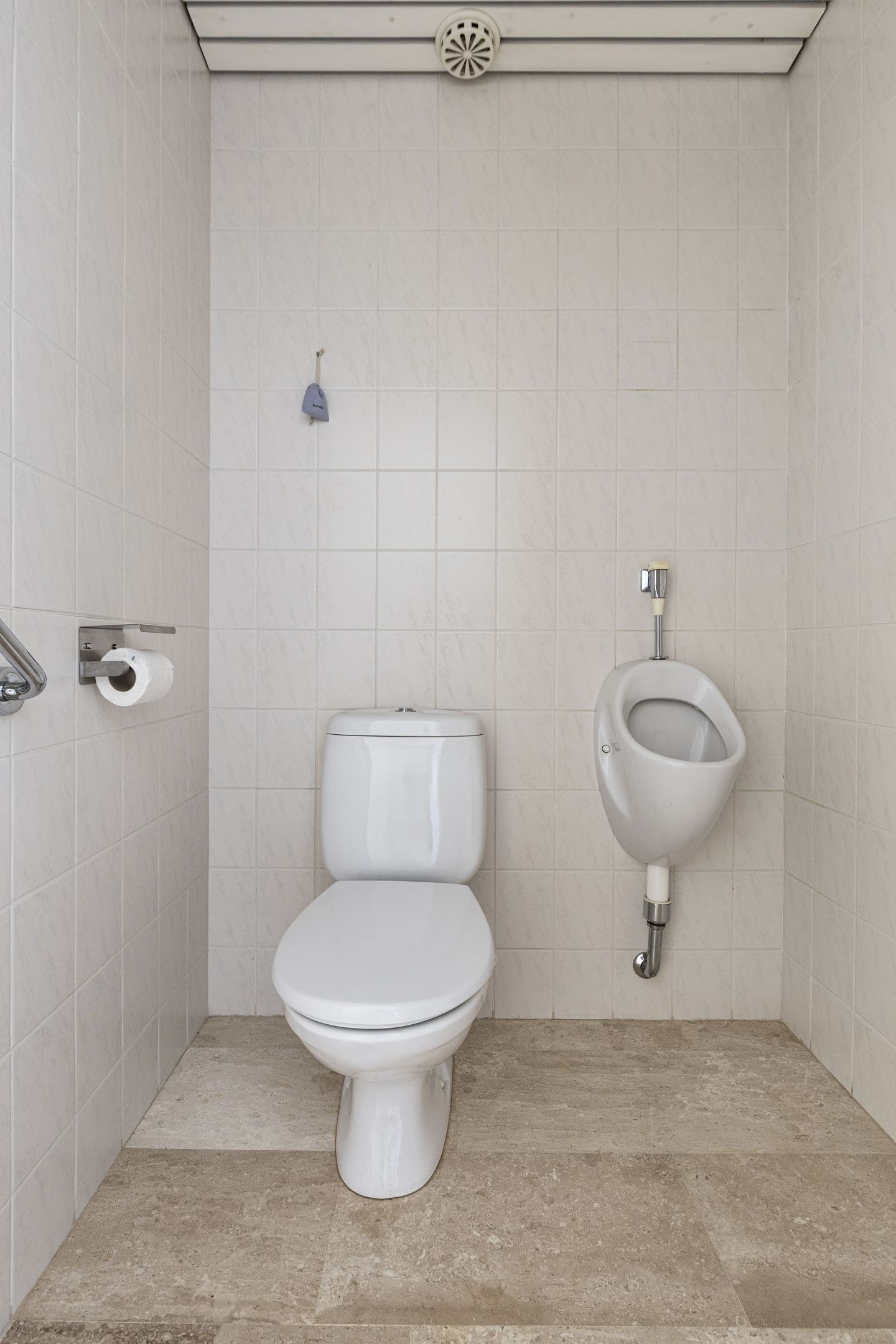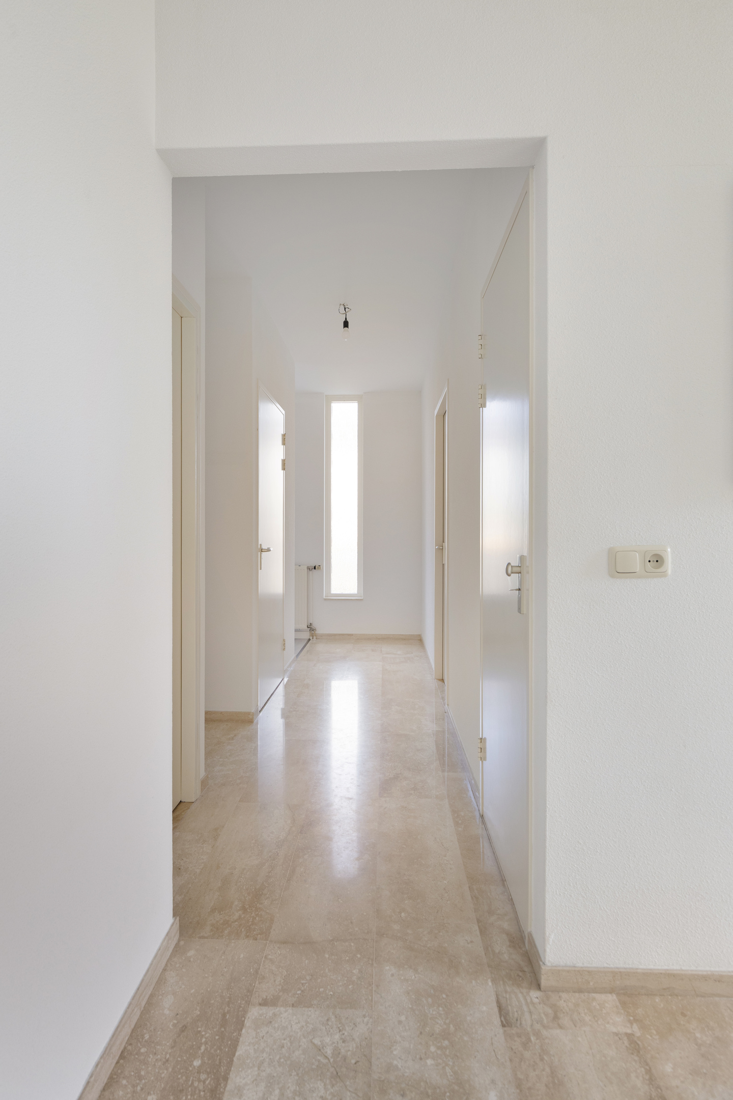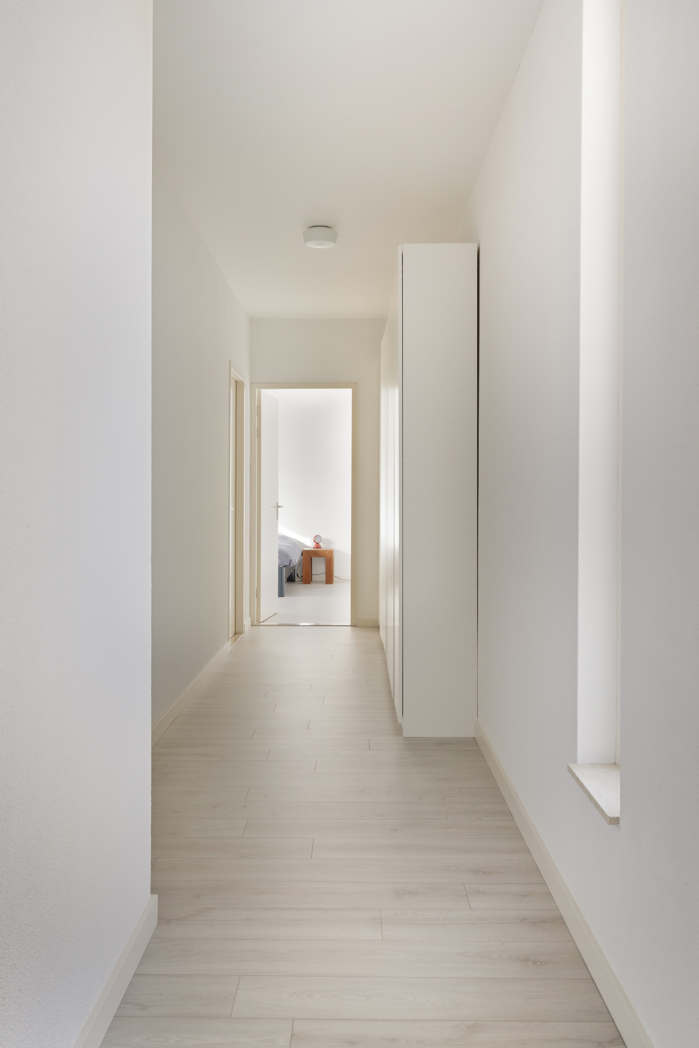 De hal naar de slaapvleugel geeft toegang tot alle slaapvertrekken, maar ook het toilet met urinoir, de meterkast en bijkeuken met keukenblok, opstelling cv, unit van de zonnepanelen en aansluitingen voor de wasapparatuur.
