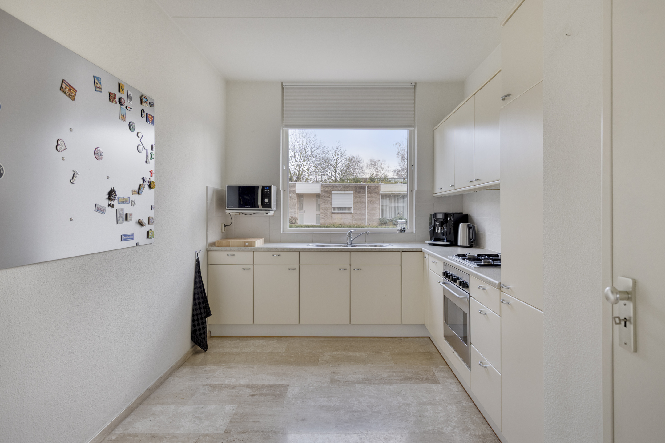 De separate keuken in hoekopstelling is voorzien van een 4-pits gaskookplaat, dubbele spoelbak, koelkast en vriezer, oven en een vaatwasser. Een vaste inbouwkast geeft extra opbergruimte.