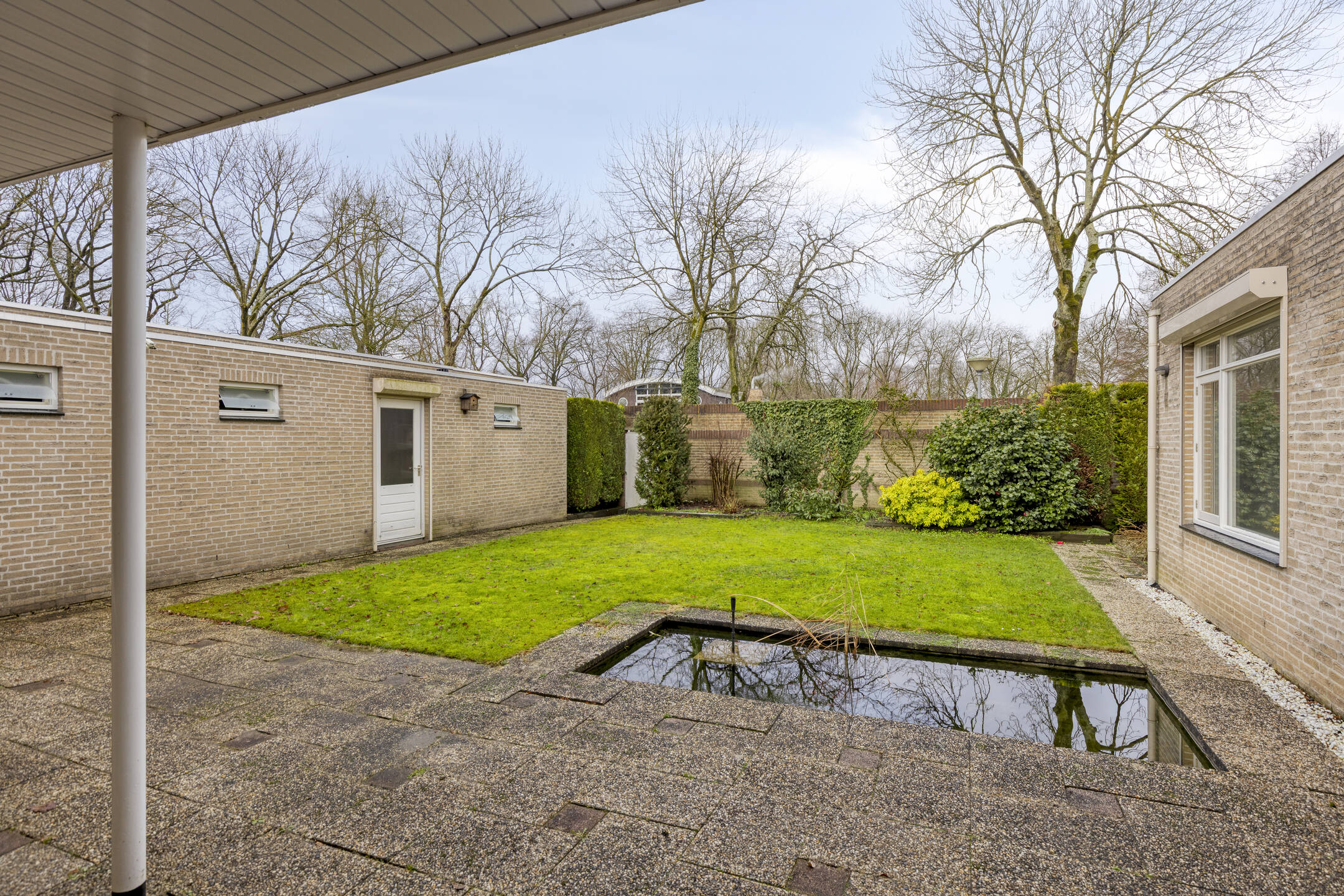 Vanuit de woonkamer heeft u via openslaande deuren toegang tot de op het zonnige westen gelegen achtertuin. Een tuin met optimale privacy. Via een royaal overdekt terras kijkt u weg over de vijverpartij en het gazon. Achterin de tuin bevindt zich een 2e terras. Via de poort is de woning achterom bereikbaar. Aansluitend aan de garage, via de tuin toegankelijk, bevindt zich een extra berging. De voor- en achtertuin zijn voorzien van een beregeningssysteem.