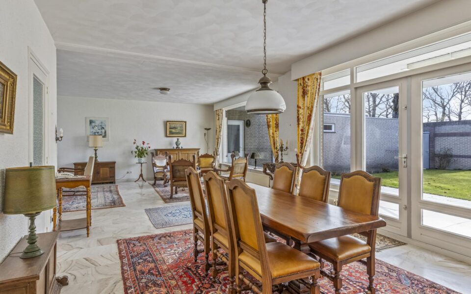 Een zeer royale hoekwoonkamer maken diverse zithoeken mogelijk. Door de grote raampartijen kijkt u mooi weg over het hofje aan de voorzijde en de achtertuin en geniet deze woonkamer van veel natuurlijke lichtinval.